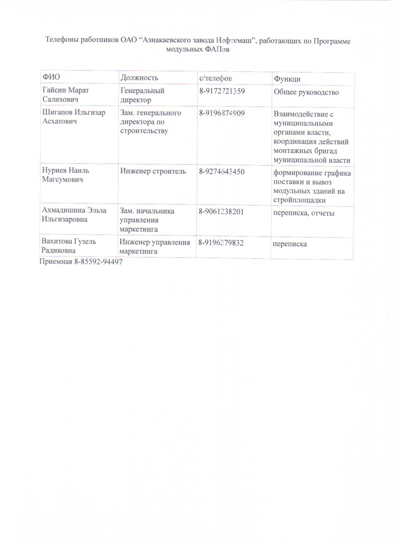 Телефоны сотрудников ОАО «Азнакаевский завод Нефтемаш», ответственные за виды работ по модульным офисам