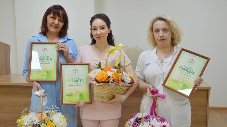 The head physician of the Children's Municipal Hospital with PC Ramil Khamidullin and the head nurse Ilsiyar Motygullina congratulated the employees of PCR diagnostic laboratory on Medical Worker Day and presented them bouquets of flowers and certificates of honor.