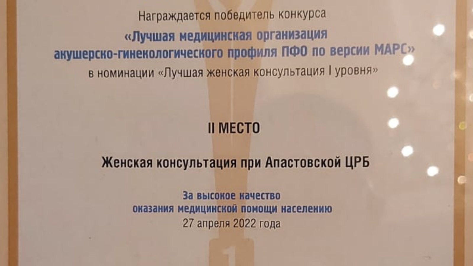 Women's Health Clinic under the SAHI Apastovo CDH took the second place in the nomination “Best Women's Health Clinic of the I Level" of the competition “Best Medical Organization of the Obstetric and Gynecological Profile of the Volga Federal District – 2021”.