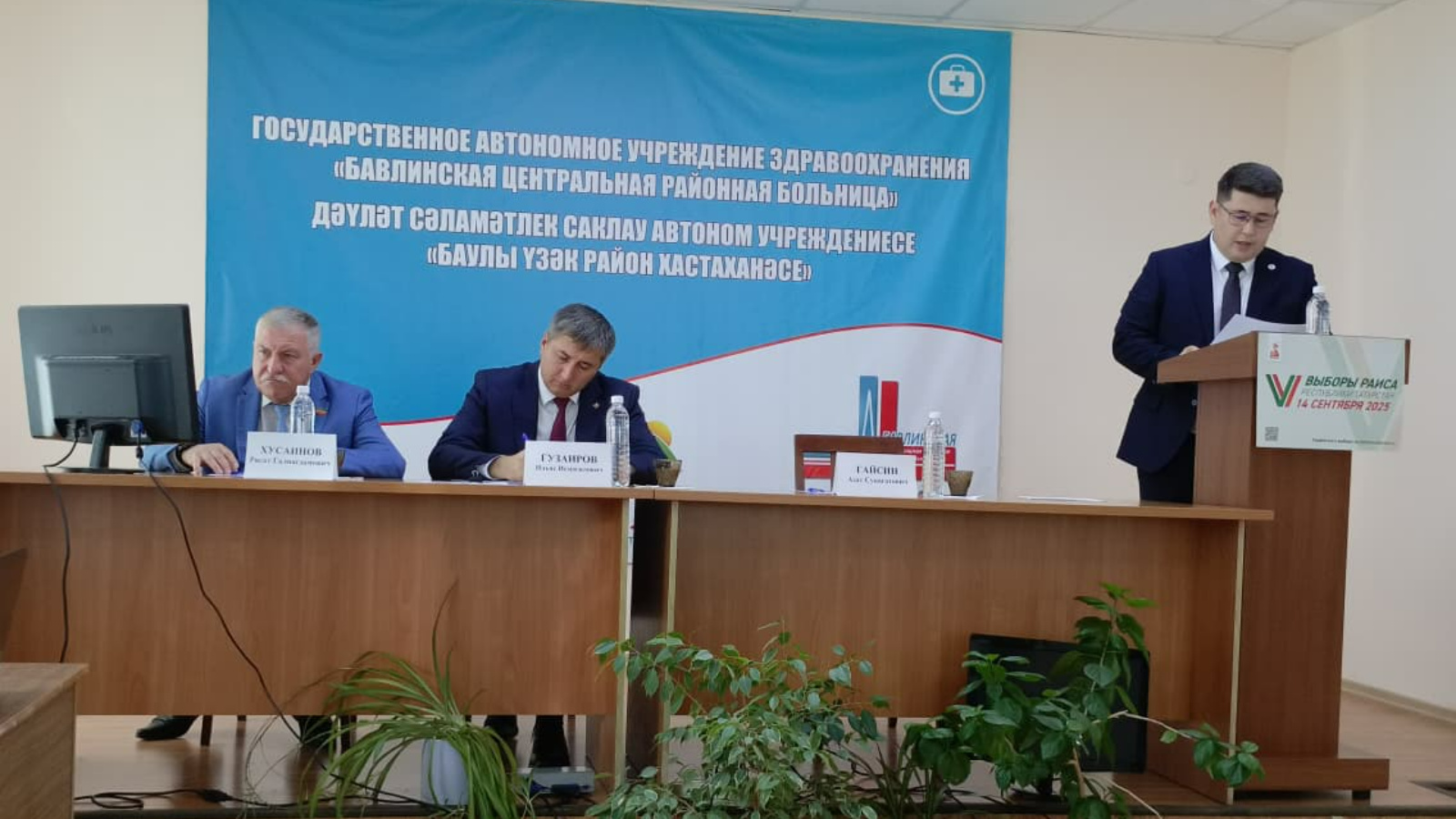 A meeting of the labor collective was held in the administrative building of the Bavli Central District Hospital, attended by Ryagat Khusainov, Chairman of the Committee of the State Council of the Republic of Tatarstan, and Ilyas Guzairov, Head of the Bavli municipal district.