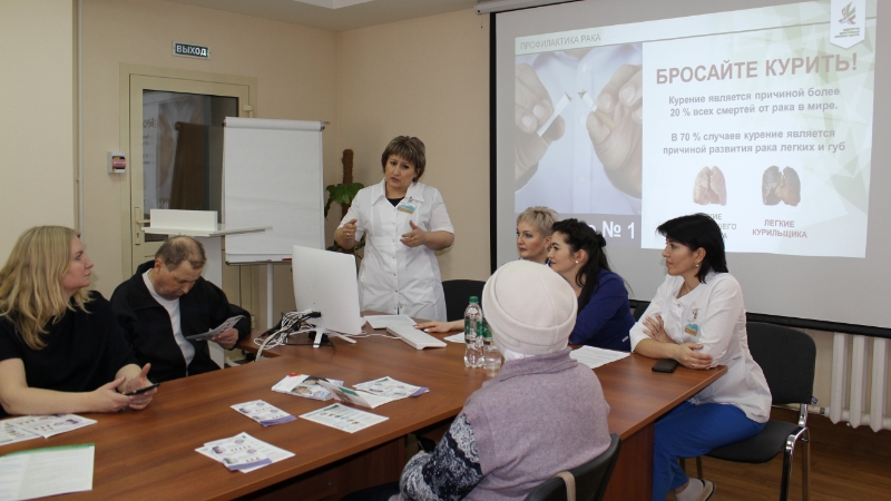 Организованная в начале февраля Школа здоровья для пациентов и их близких включала в себя три темы: «Профилактика рака. Питание против рака. Продукты против рака», «Рак легких, профилактика, лечение», «Красота против рака. Уход за кожей и макияж во время прохождения сеанса химиотерапии». Спикерами выступили заведующая дневным стационаром химиотерапии № 3 Альфия Сафарова и врач-онколог дневного стационара химиотерапии № 3 Алевтина Закирова.