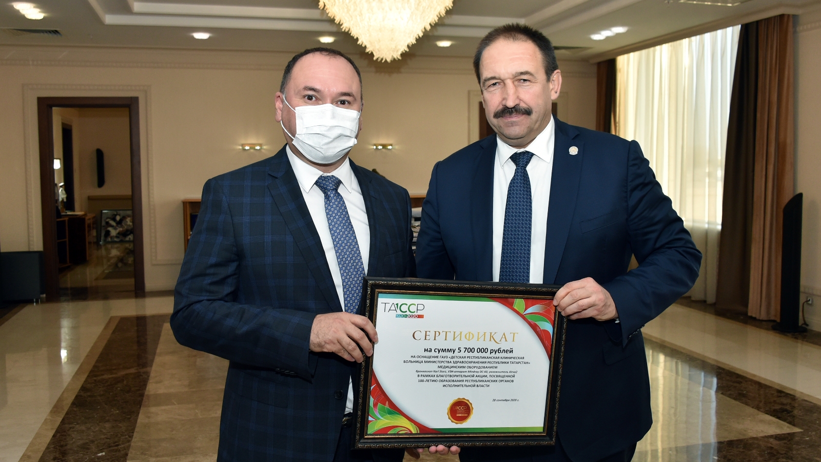 Сертификат на 5,7 млн рублей передали медицинскому учреждению в рамках благотворительной акции, посвященной 100-летию образования республиканских органов исполнительной власти и вековому юбилею системы здравоохранения Татарстана.