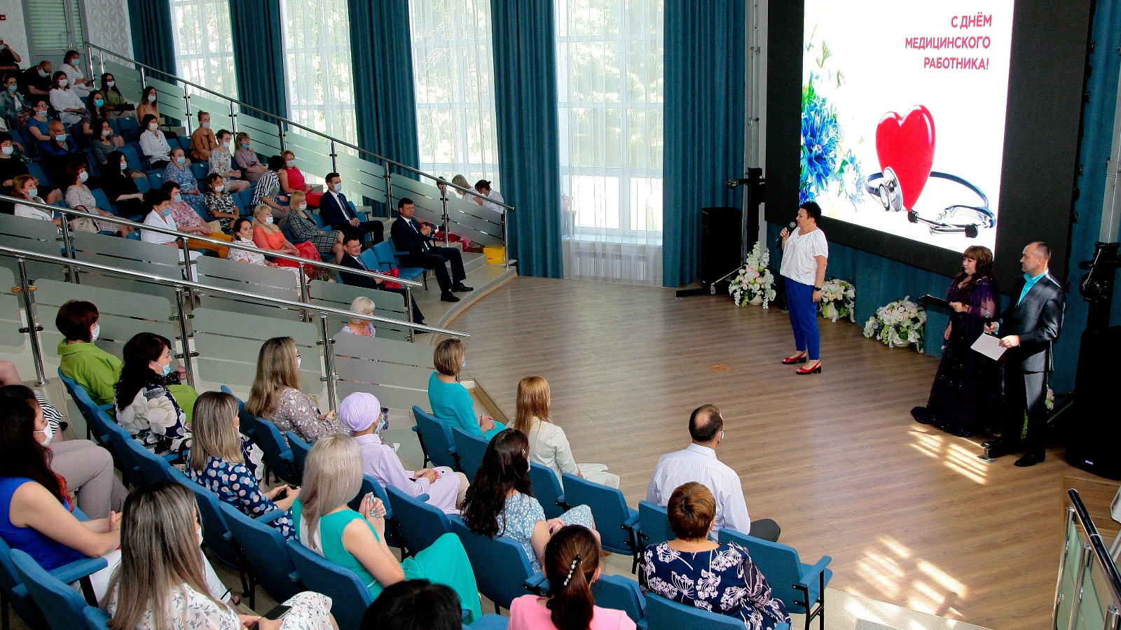 Медики окунулись в праздничную атмосферу. Этот день был наполнен песнями, танцами, поздравлениями и цветами. Первым коллег поздравил главный врач НЦРМБ Марс Мустафин.