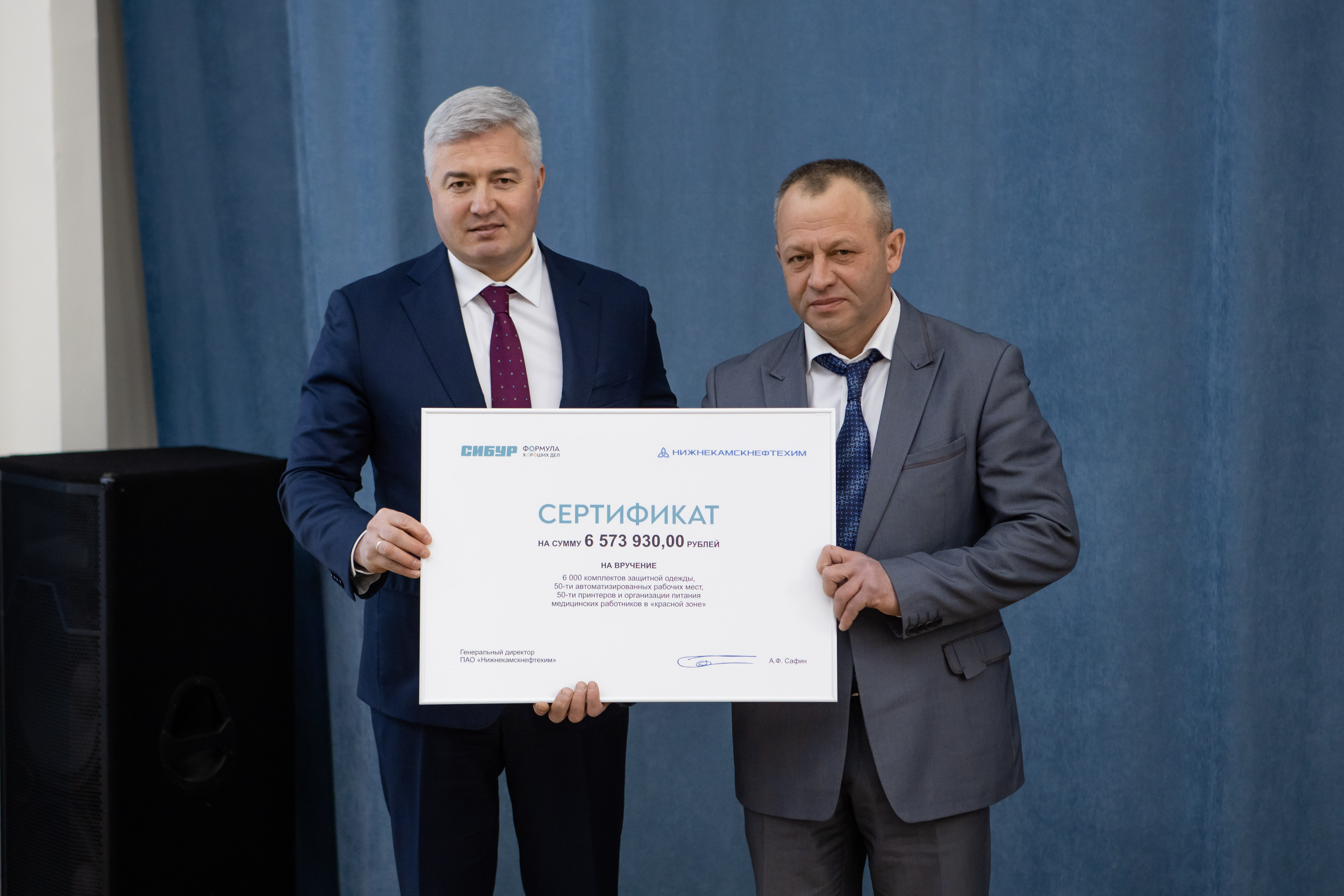 А. Сафин передал руководителю Управления здравоохранения Сергею Мерясеву сертификат на приобретенное медицинское оборудование и материалы на сумму 6,5 млн рублей. С. Мерясев в свою очередь отметил, что с самого начала пандемии медицинских работников очень поддерживает и исполком, и градообразующее предприятие: «Вы отвечаете на все наши просьбы и помогаете с любым вопросом. Для нас это очень важная поддержка, и мы знаем, что мы не одни, что нам помогут в трудную минуту. Спасибо вам от всего медицинского сообщества! Благодарю и коллег, которые вот уже два года трудятся с огромной нагрузкой. Спасибо за ваши добрые сердца, за верность профессии!».