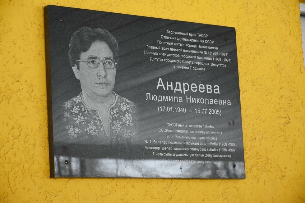 В Нижнекамской детской городской больнице с перинатальным центром увековечили память первого главного врача детской поликлиники Людмилы Андреевой. На входе в поликлинику №1 ДГБ с ПЦ установлена мемориальная доска. Именно при активном участии Людмилы Николаевны Андреевой появилась эта детская поликлиника, и именно сегодня славному доктору исполнилось бы 82 года. В торжественном мероприятии приняли участие руководители всех лечебных учреждений города, родные Людмилы Николаевны, её друзья и коллеги.