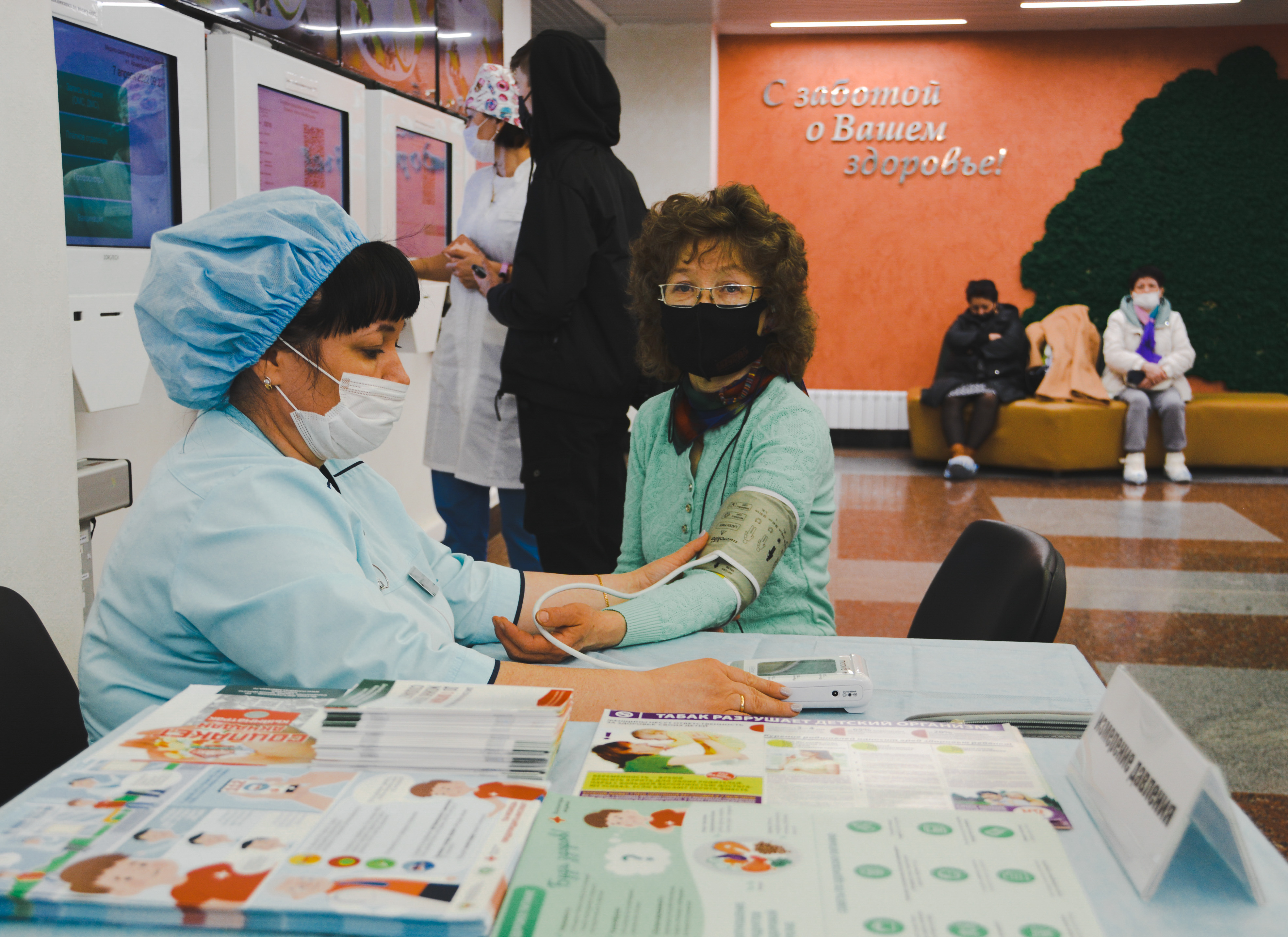 Мероприятие по профилактике сердечно-сосудистых заболеваний провели в холле поликлиники. Все желающие могли измерить свое артериальное давление, сатурацию, рост, вес, индекс массы тела.