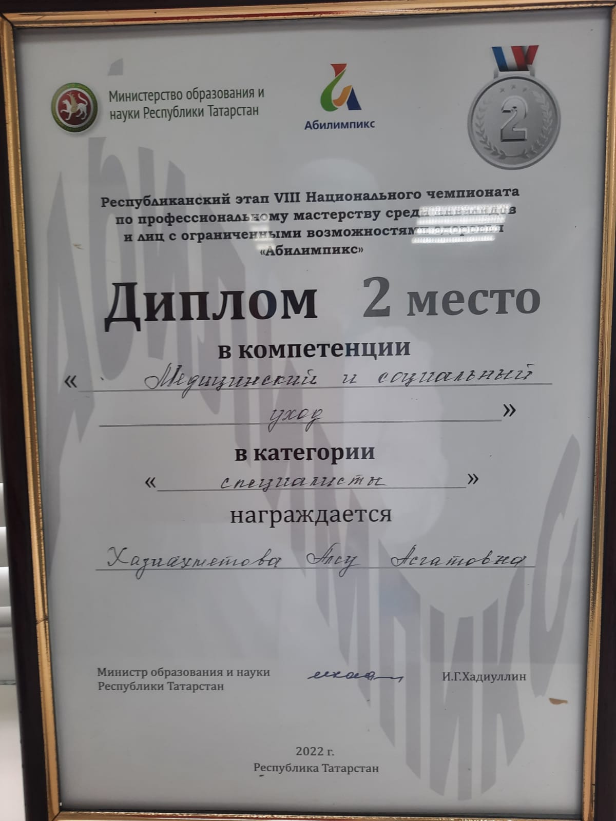 Дипломом 2 степени в компетенции "Медицинский и социальный уход" награждена медицинская сестра отделения профилактики Альметьевской ЦРБ Хазиахметова Алсу Асгатовна.