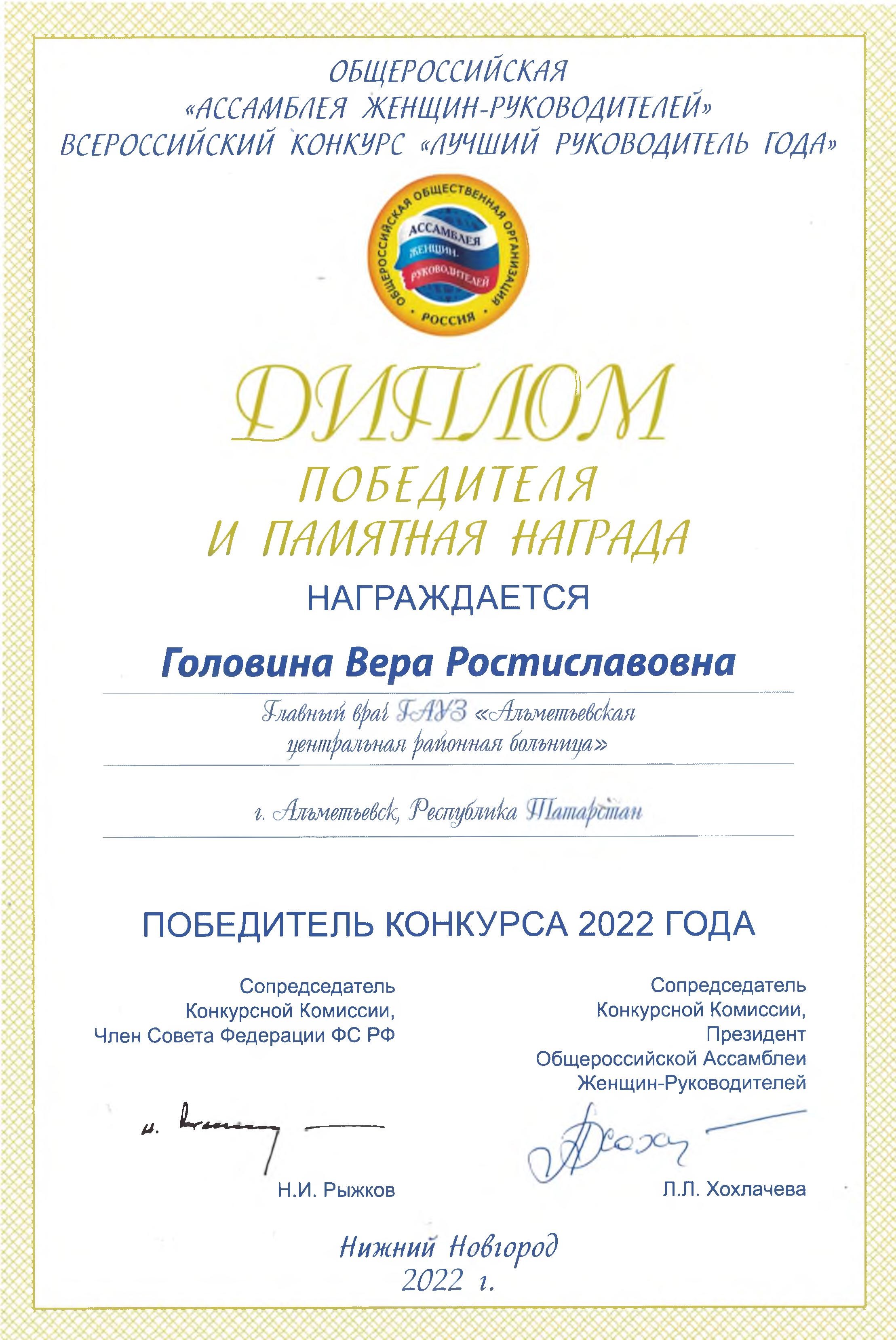 Заслуженный врач Республики Татарстан, главный врач ГАУЗ «Альметьевская ЦРБ» Вера Головина стала победителем Всероссийского конкурса Ассамблеи женщин-руководителей «Лучший руководитель года».