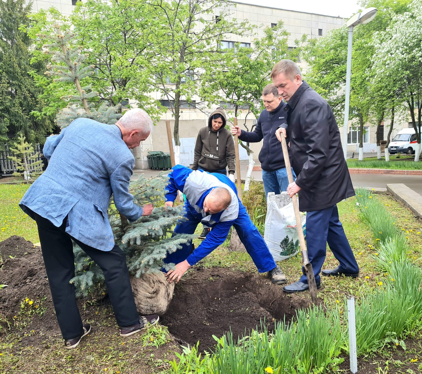 Вместе с коллегами посадили памятную ель вдова Дмитрия Васильевича Оксана Смородинова (она работает медицинской сестрой в 5-й горбольнице) и его сын Артём.