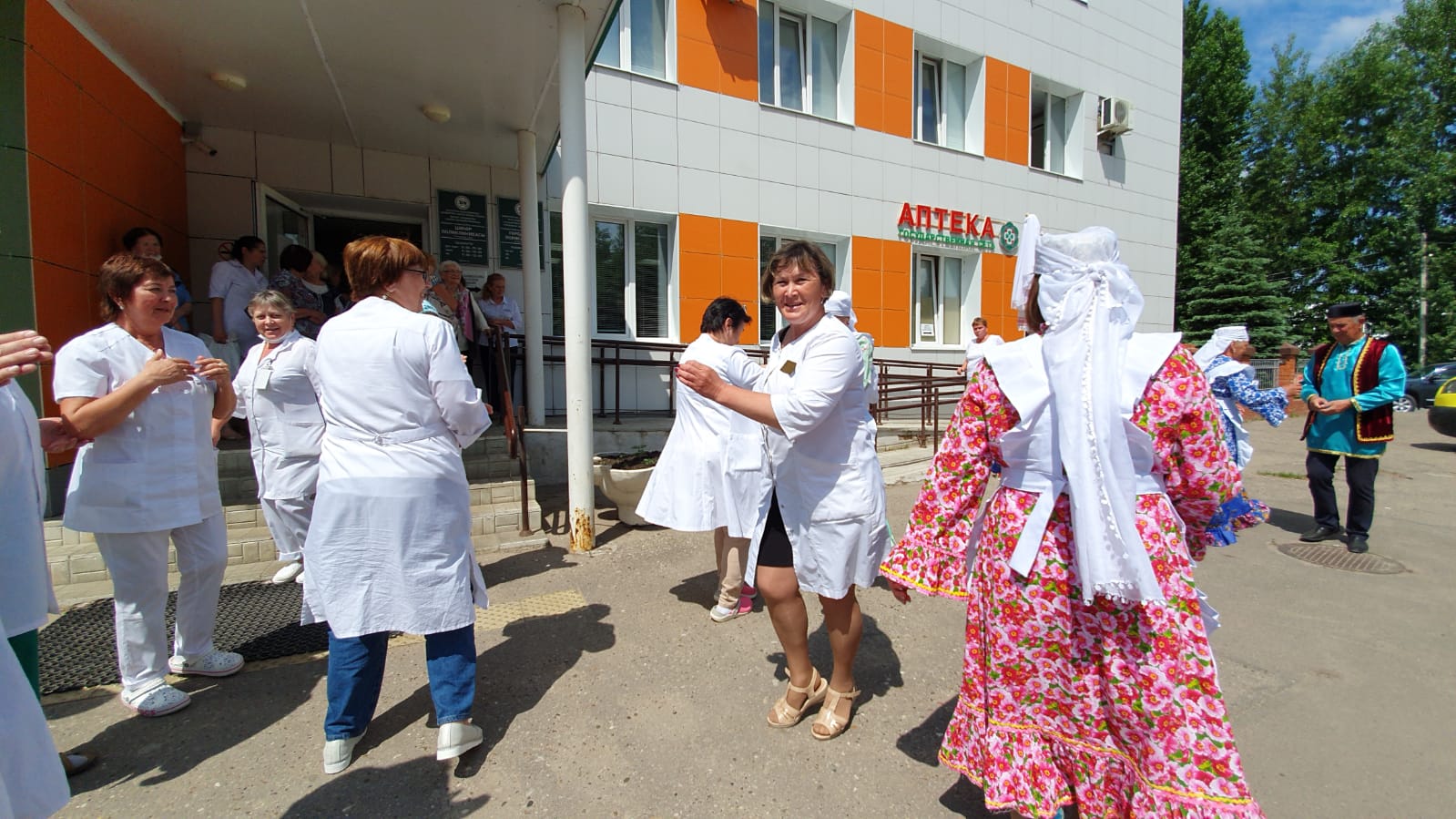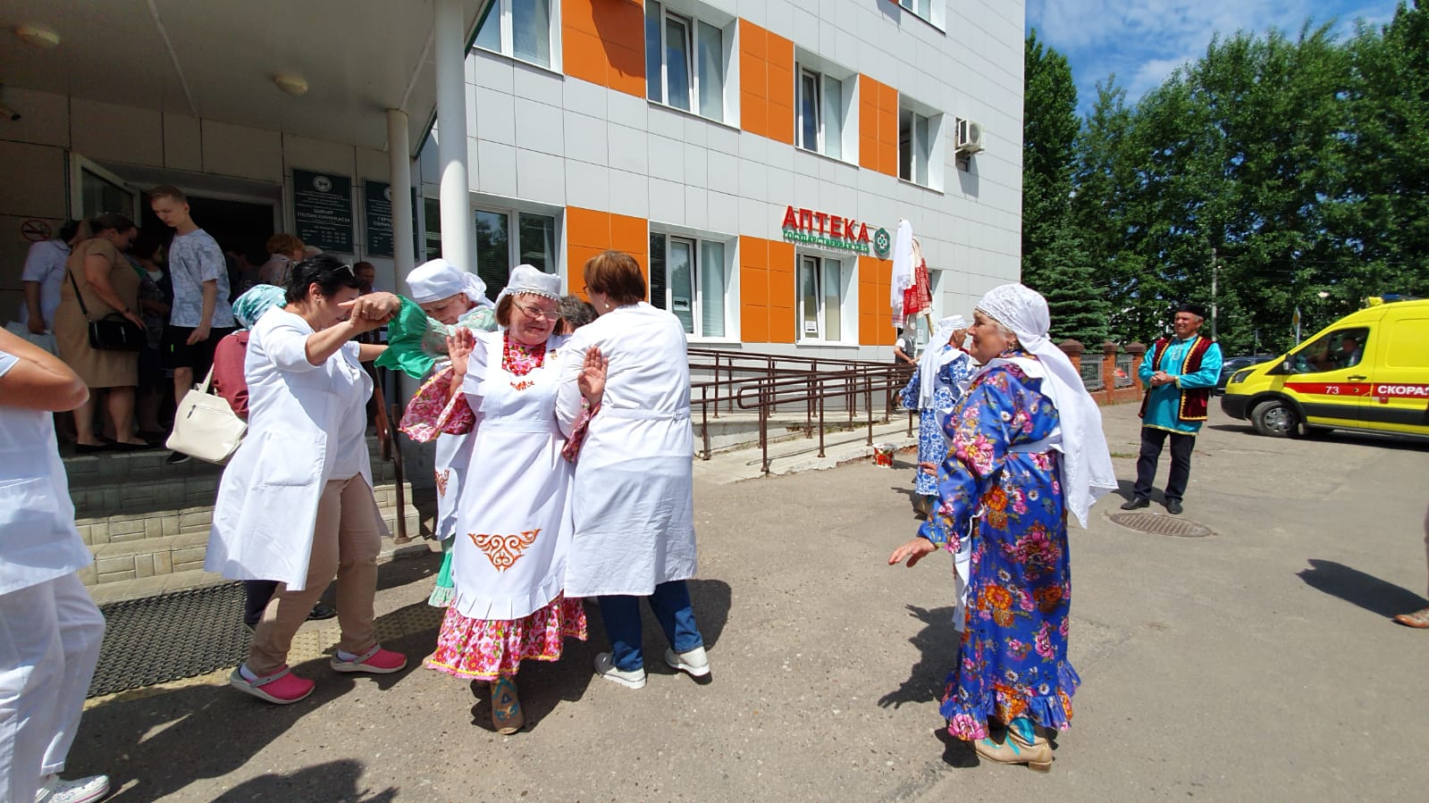 На территории поликлиники ГАУЗ "Клиника медицинского университета" г.Казани состоялся старинный и красивый татарский обряд "Яулык жию", что в переводе означает "Сбор полотенец". Обряд проводится у татар перед Сабантуем. На задорный голос гармони из дома выходят люди и пускаются в пляс вместе с артистами. Обязательно выносят подарки для сабантуя. "Сбор полотенец и подарков" - это как весточка от Сабантуя.