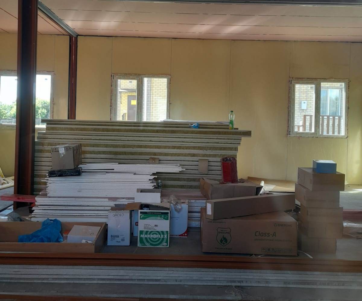 На сегодняшний день проведены коммуникации, собран каркас здания, завершены кровельные работы, установлена входная дверь и пластиковые окна. Скоро начнётся внутренняя отделка помещений.