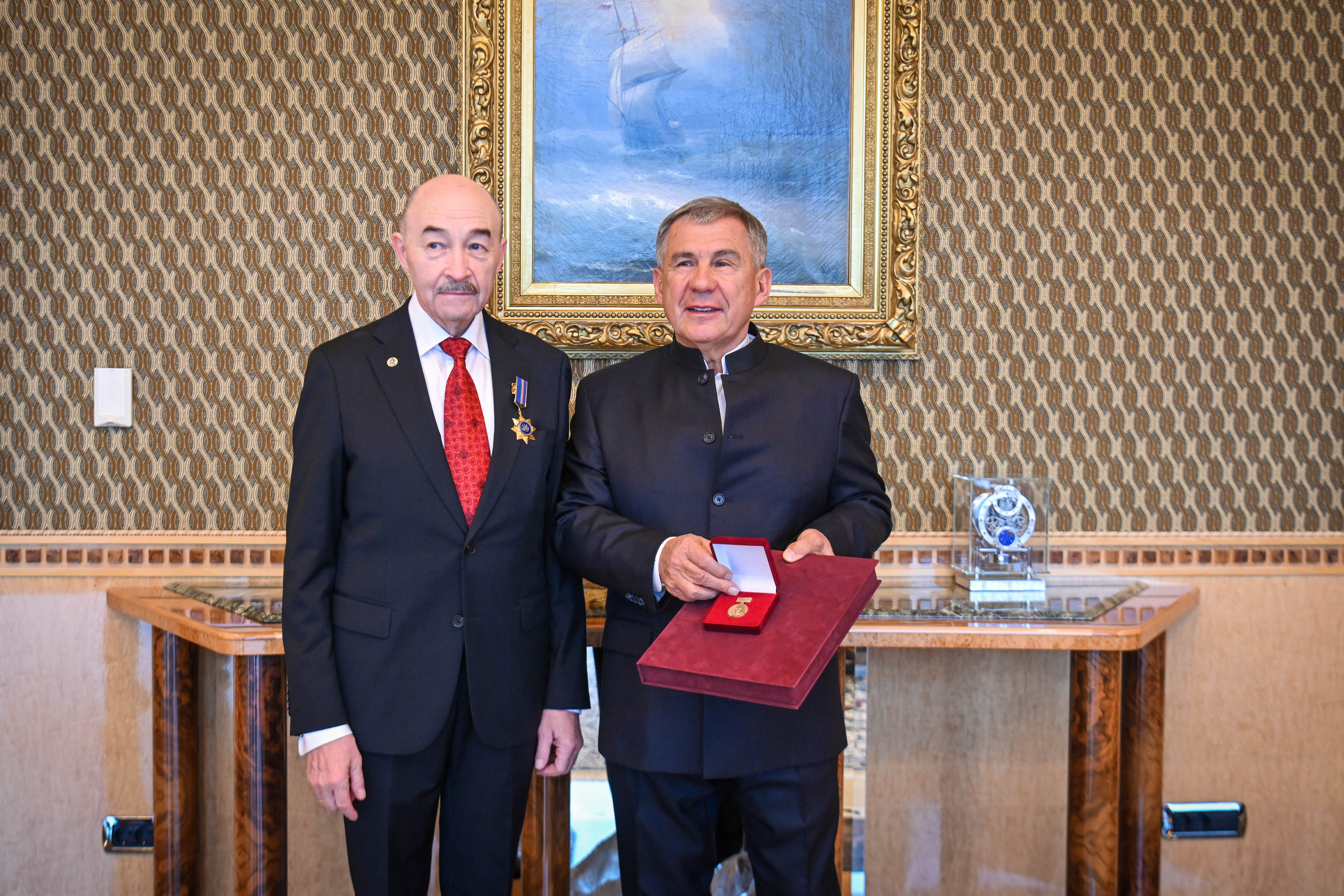 В свою очередь, Сергей Готье вручил Президенту Татарстана медаль «Академик В.И.Шумаков». Эта награда учреждена в качестве общественного признания заслуг награждаемого лица в области трансплантологии, создания искусственных органов, сердечно-сосудистой хирургии.