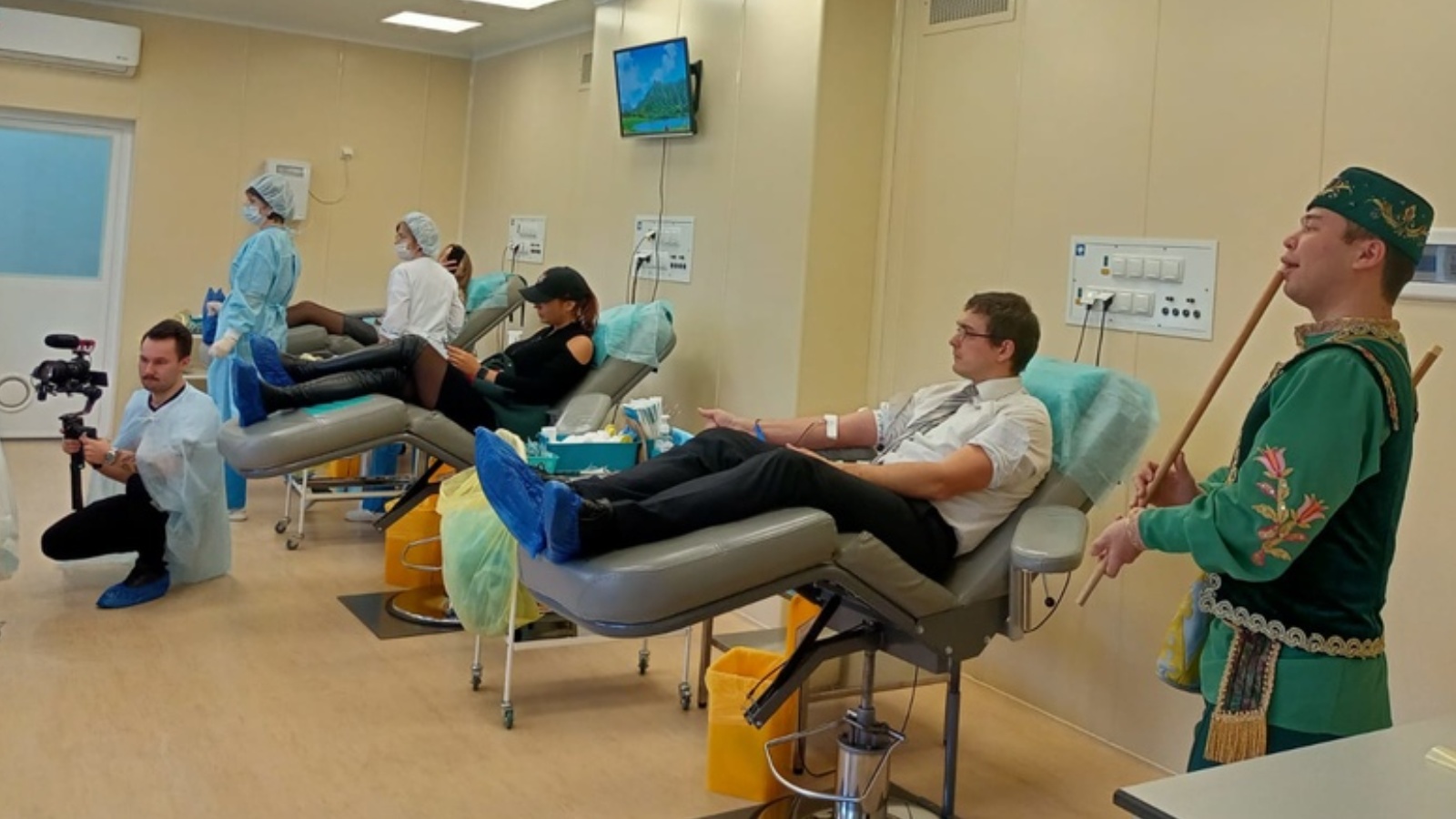 А в зале для донаций крови исполнитель на курае играл пронзительные мелодии, которые доходили до самого сердца.