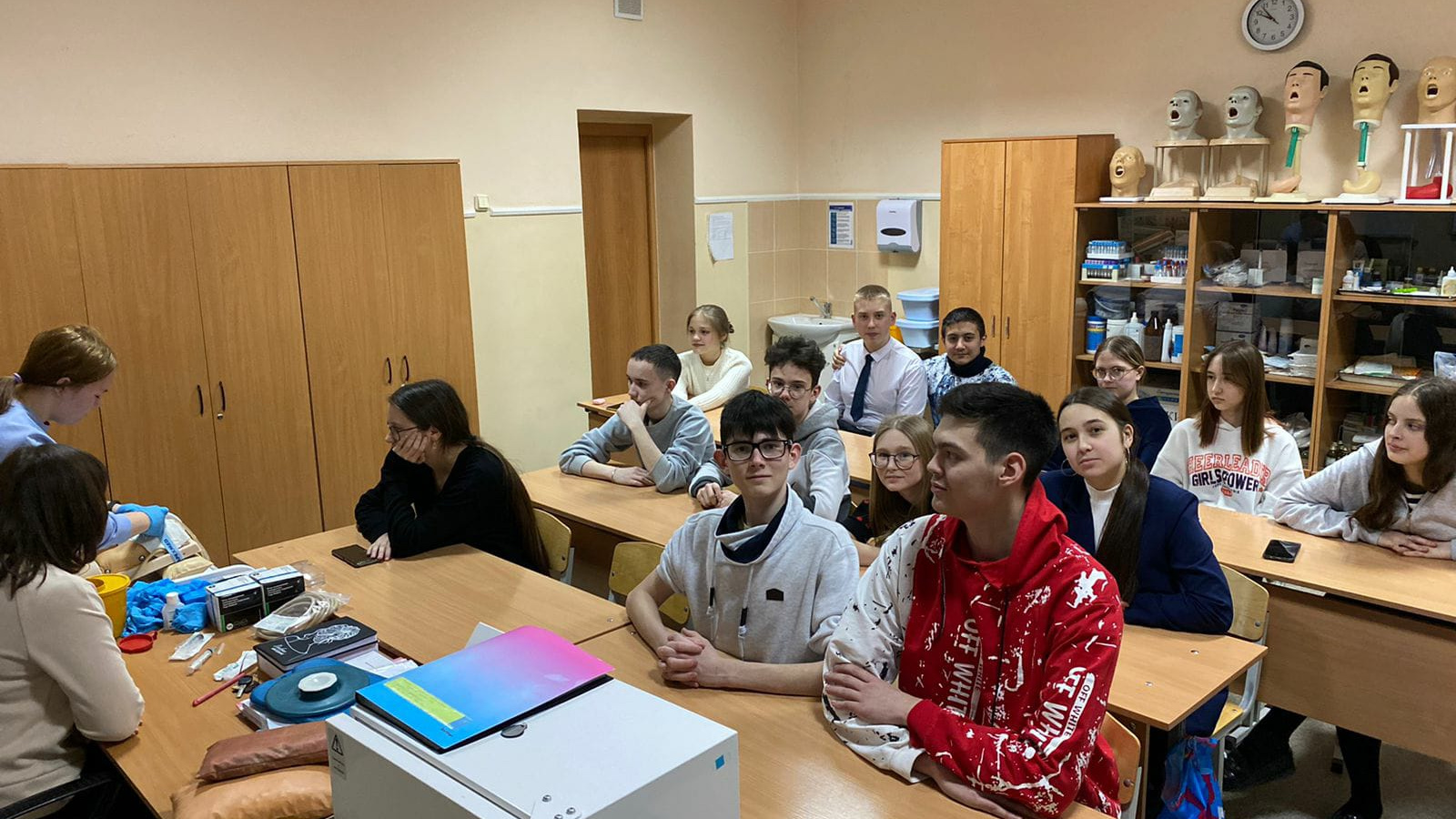Всего из разных школ г. Нижнекамска занимаются в таких классах 30 человек, это школы № 3, 7, 14, 25, 26, 29, 31. На занятиях ребятам рассказывают о медицине и системе здравоохранения города Нижнекамска, РТ, РФ, знакомят со специальностями, по которым обучают в колледже.