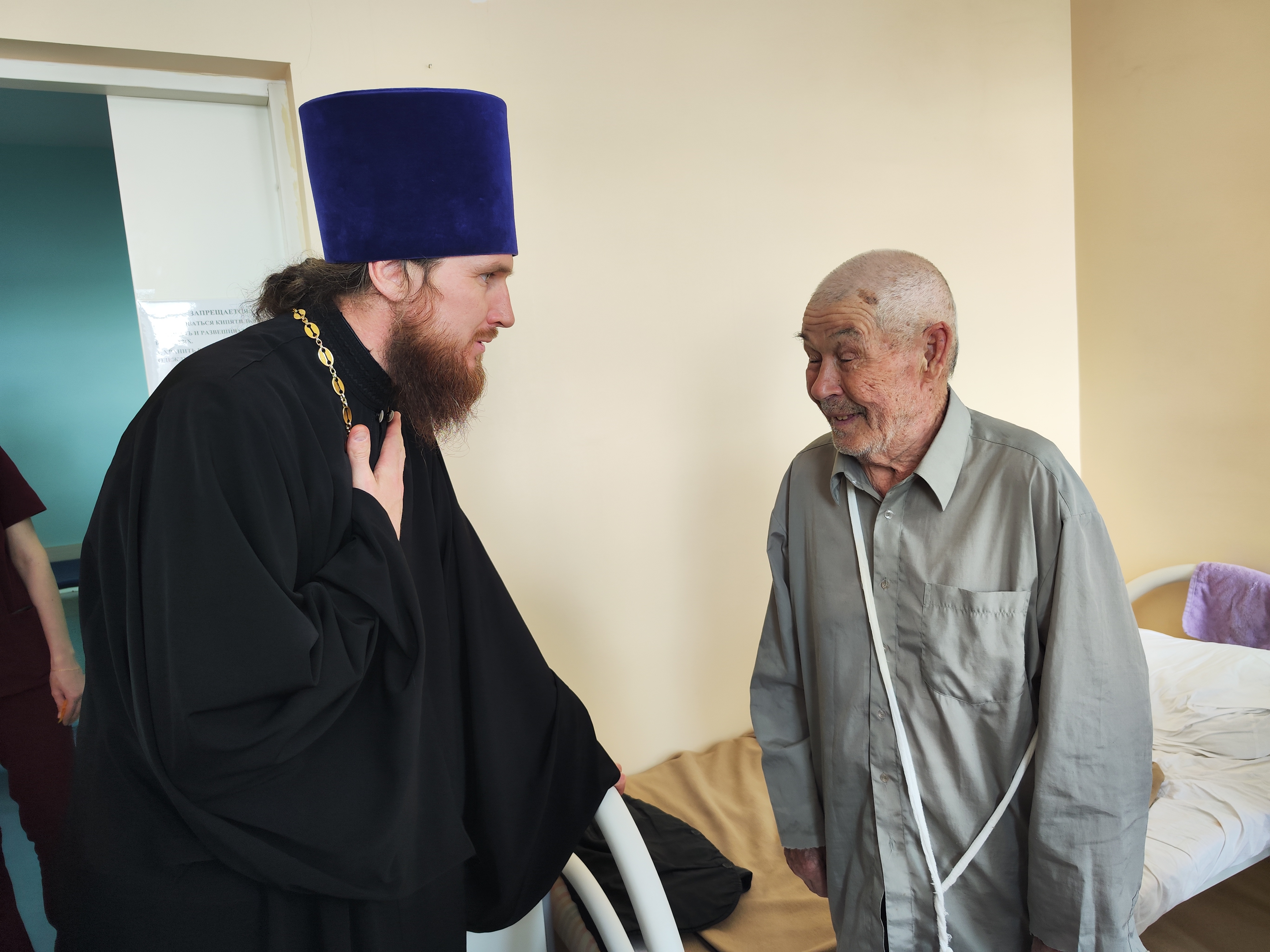 В дни Пасхальной седмицы руководитель Епархиального отдела по социальному служению иерей Константин Петряев, заместитель секретаря Альметьевской епархии иерей Максим Аширматов и сестры милосердия Свято-Ксениевского сестричества города Альметьевска посетили и поздравили со Светлым праздником Пасхи медицинских работников центральной больницы и находящихся там пациентов, в том числе Ветерана Великой Отечественной Войны Гараева Гибадуллу Гарифулловича.