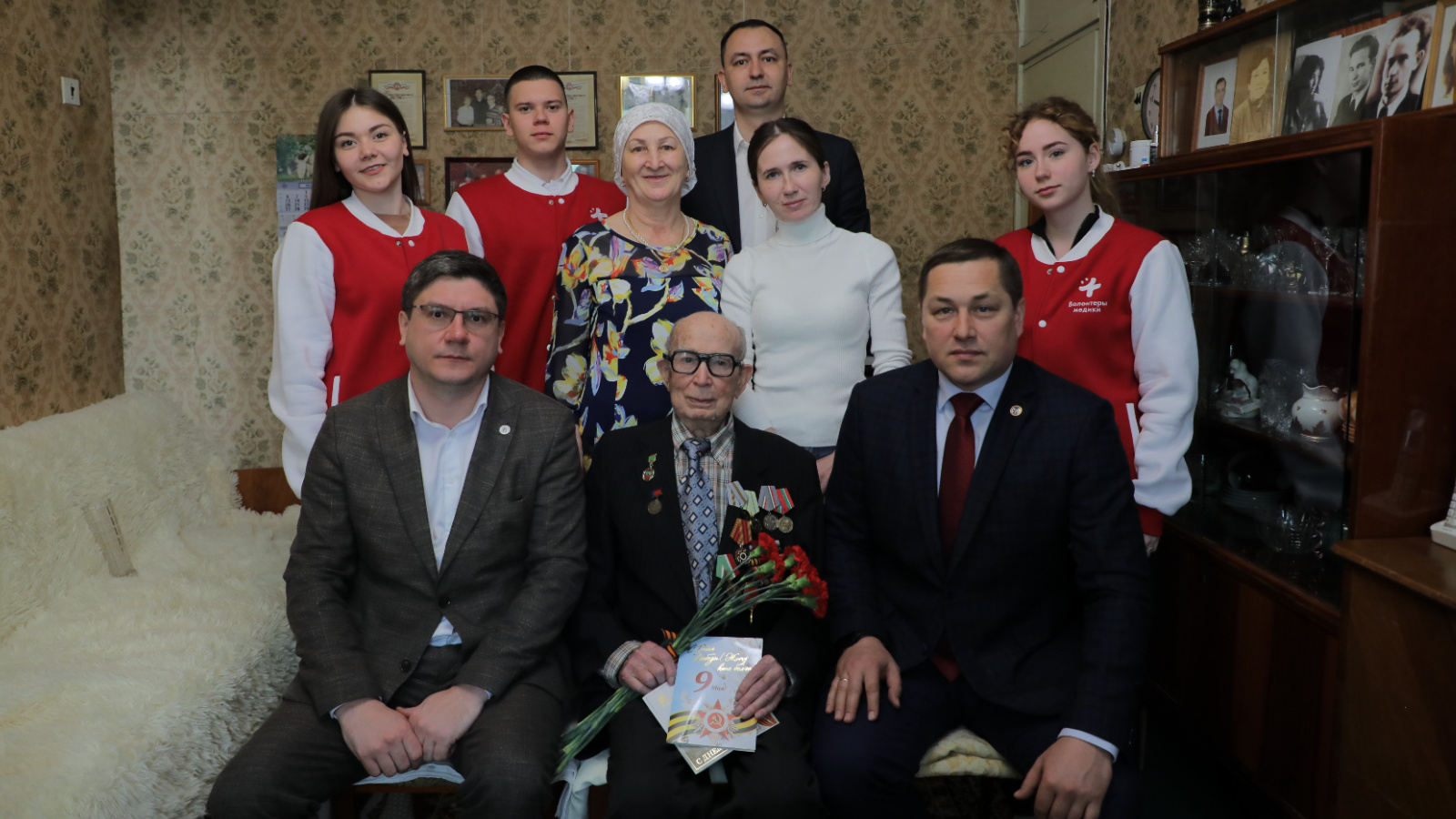Волонтёры Казанского медицинского колледжа, управляющий делами Минздрава РТ Идеал Айзетуллов в канун 9 Мая навестили майора медицинской службы в отставке, кандидата медицинских наук, заслуженного врача ТАССР Асхата Гиниатулловича Гиниатуллина, который проживает в г. Казани.