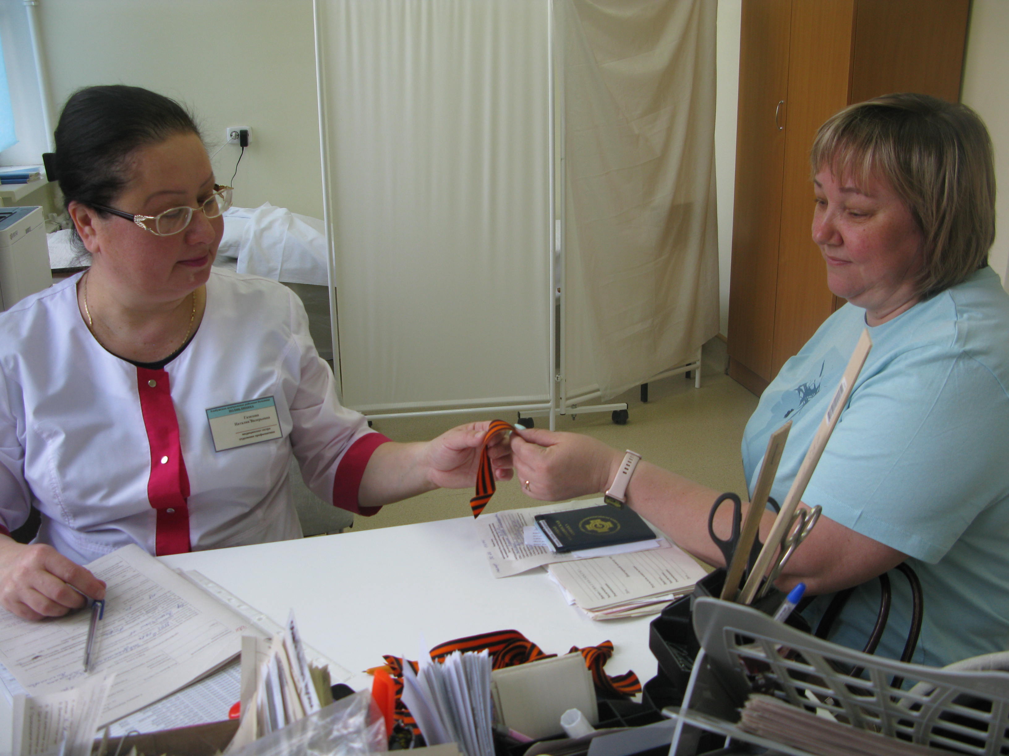 Сегодня в здании больницы, поликлиники и детской поликлиники елабужанам вручали символичные «Георгиевские ленточки». Вручали везде: в фойе, коридорах, на приемах у специалистов. Таким образом, коллектив Елабужской ЦРБ тоже присоединился к Общероссийской акции, которая проходит ежегодно в преддверии 9 Мая.