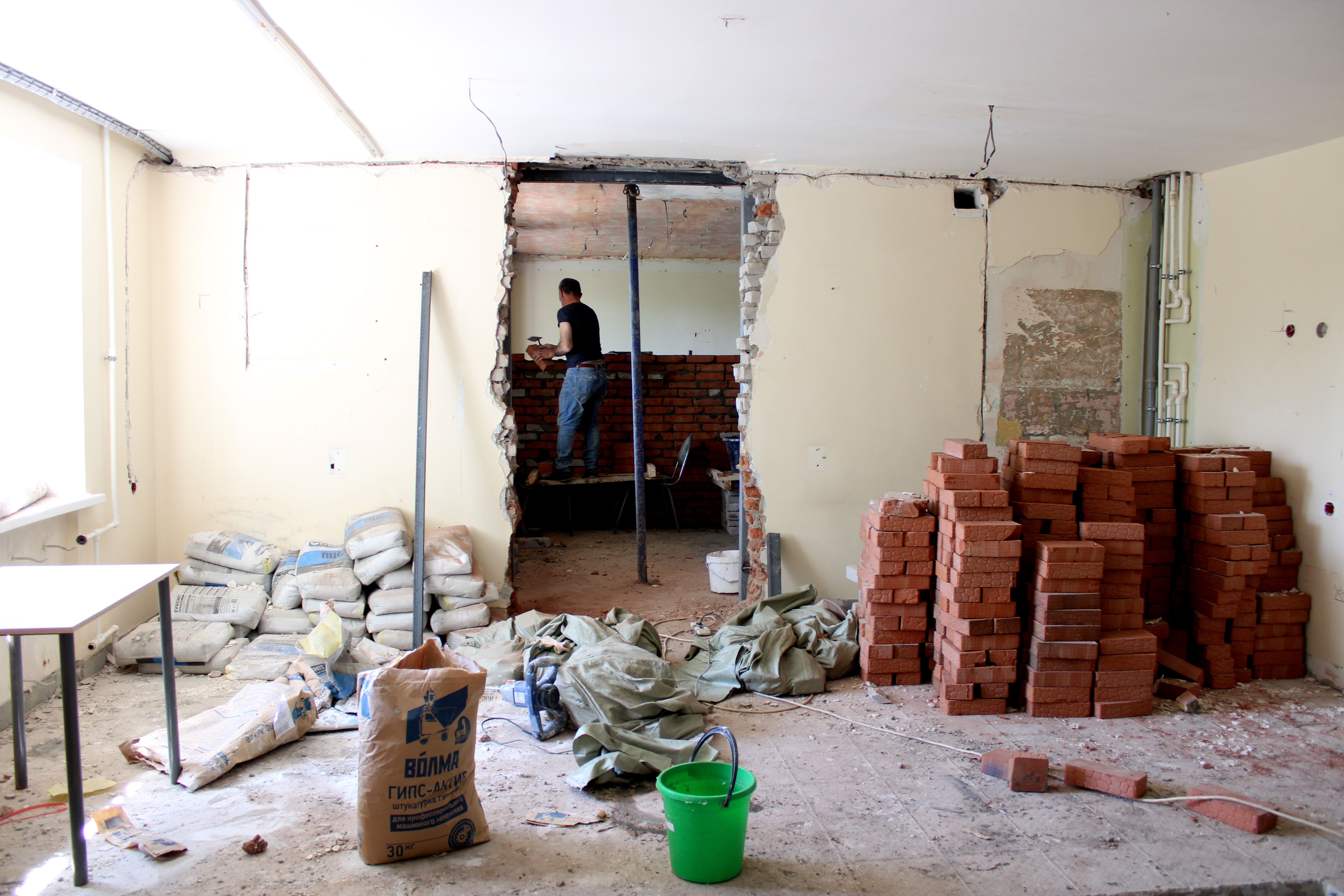 На данный момент выполнен демонтаж к перепланировке помещения, начался монтаж новых перегородок, идет демонтаж трубопровода водоснабжения и канализации.