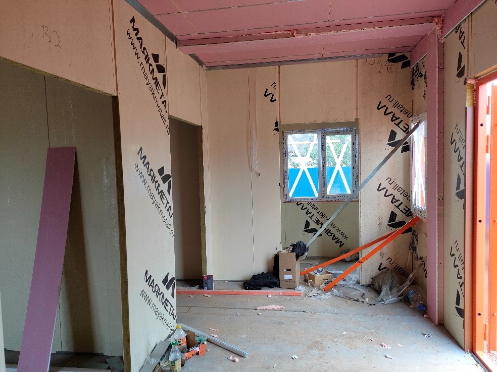 В настоящее время каркас смонтирован, устанавливаются межкомнатные перегородки.