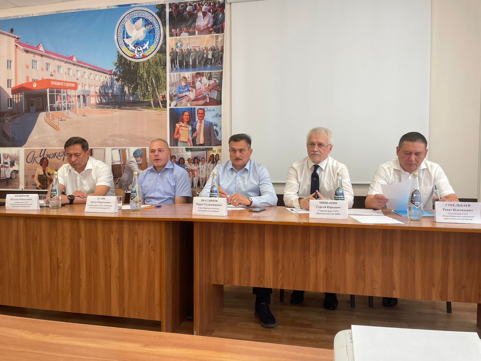 Сегодня в Верхнеуслонской ЦРБ состоялось большое совещание при участии главы Верхнеуслонского района М.Г.Зиатдинова, главного врача РКОД МЗ РТ И.Р. Хидиятова, главного врача РКНД МЗ РТ Р.И. Уткельбаева, главного врача ГКБ 7 им.М.Н. Садыкова г.Казани А.М. Деляна. Совещание было организовано по поручению министра здравоохранения РТ М.М. Миннуллина в рамках курации районов.