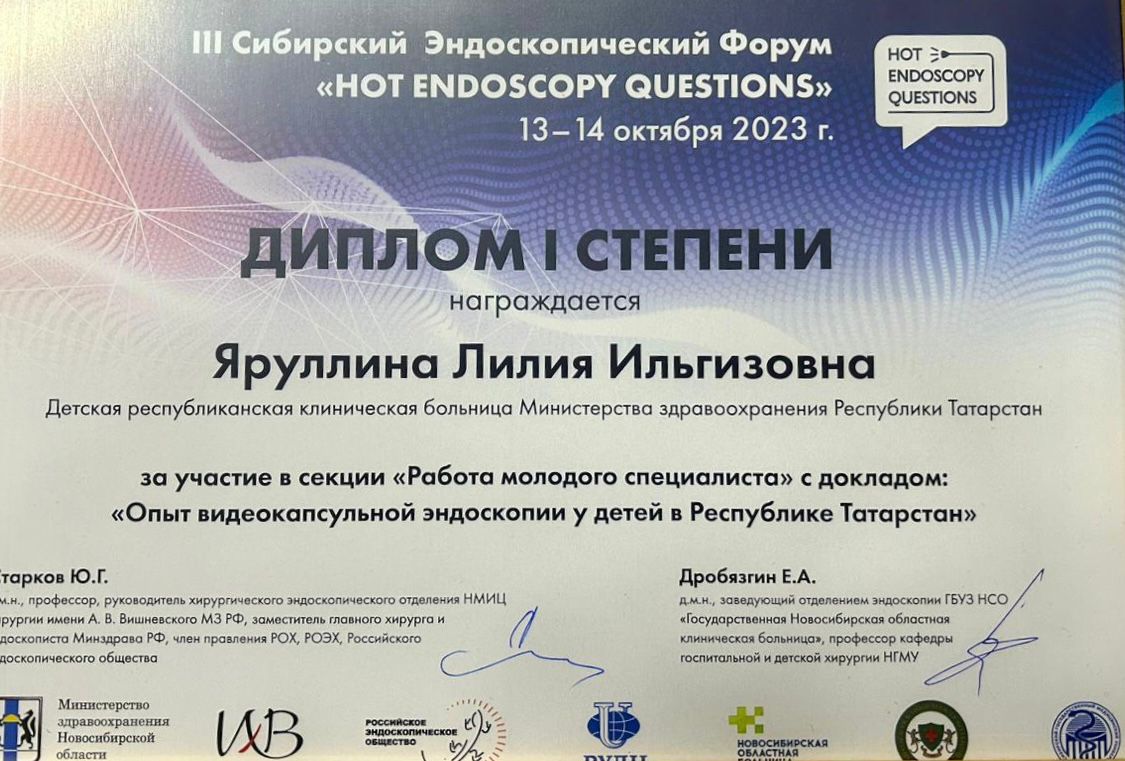 Яруллина Лилия Ильгизовна, врач-эндоскопист эндоскопического отделения ДРКБ, выступила в рамках конференции с докладом «Опыт видеокапсульной эндоскопии у детей в Республике Татарстан» и получила диплом 1 степени в конкурсе молодых специалистов в рамках III Сибирского эндоскопического форума «Hot Endoscopy Questions” в октябре 2023 года.