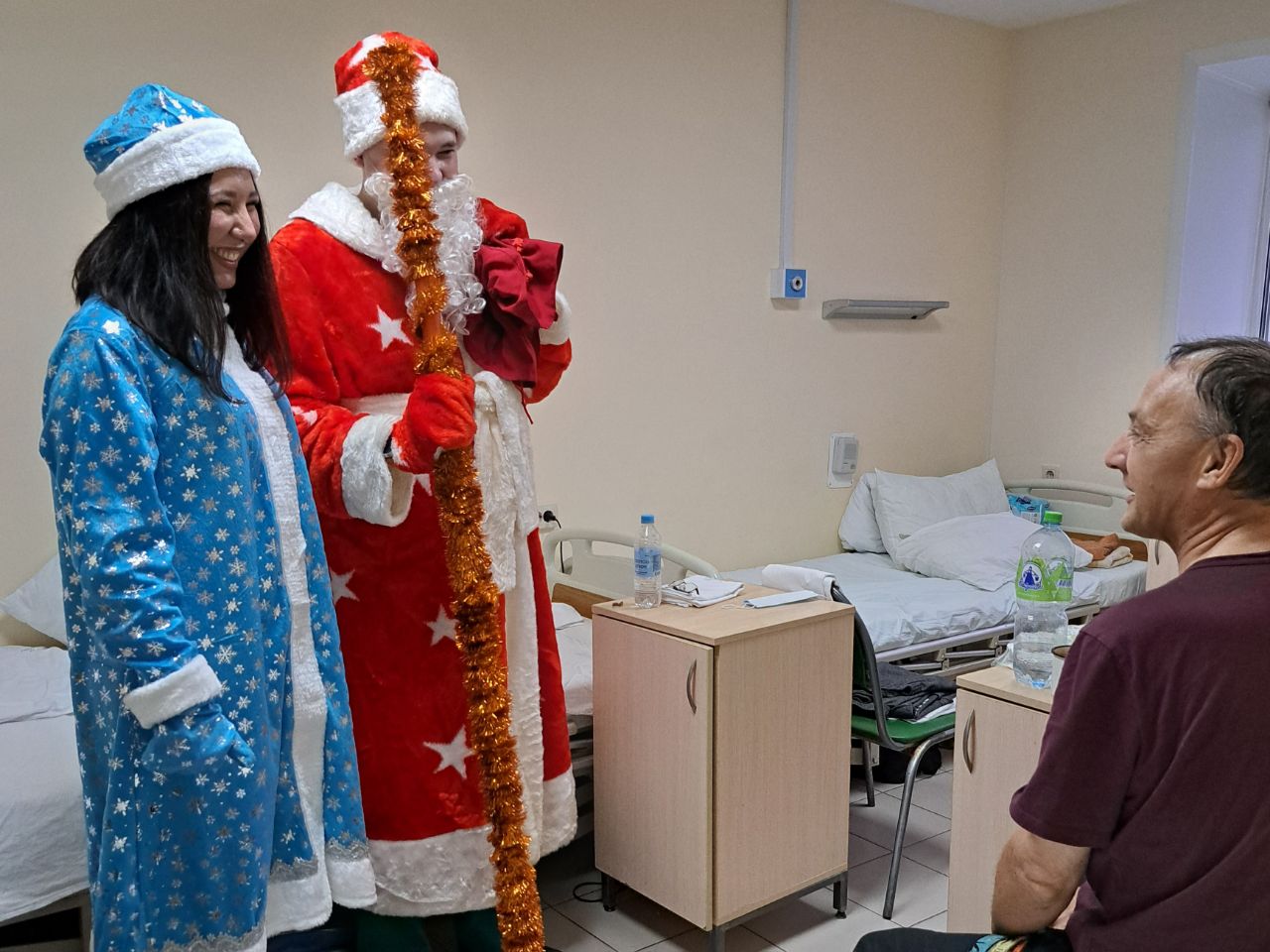 Для поздравления пациентов закупили 30 кг мандаринов, зашли в каждую палату и поздравили каждого пациента, желали им скорейшего выздоровления. Пациенты радовались Деду Морозу и Снегурочке как дети, рассказывали стишки и пели песни.