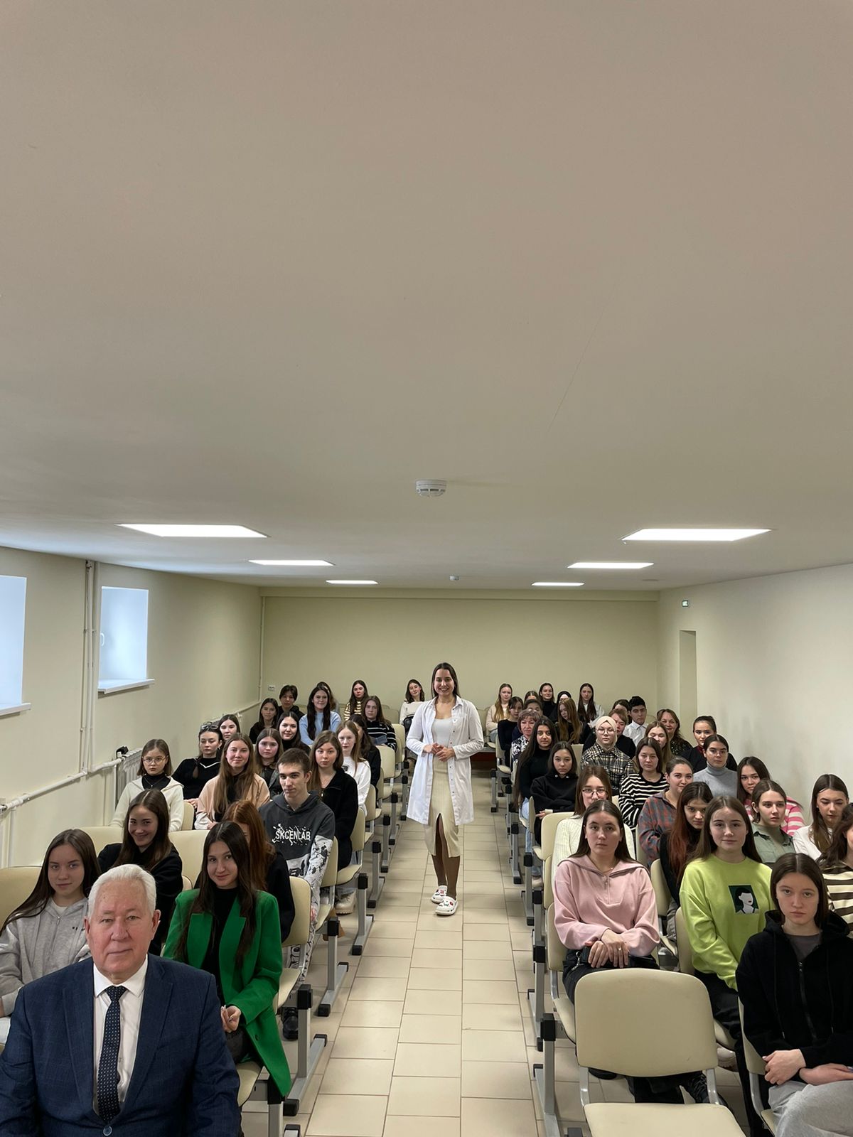 С презентацией и видеороликами о Казанском государственном медицинском университете выступила студентка 3 курса педиатрического факультета Исмагилова Тансылу, в этом ей помогал студент 2 курса лечебного факультета Харисов Рустам. Оба они учатся по программе целевой подготовки кадров.