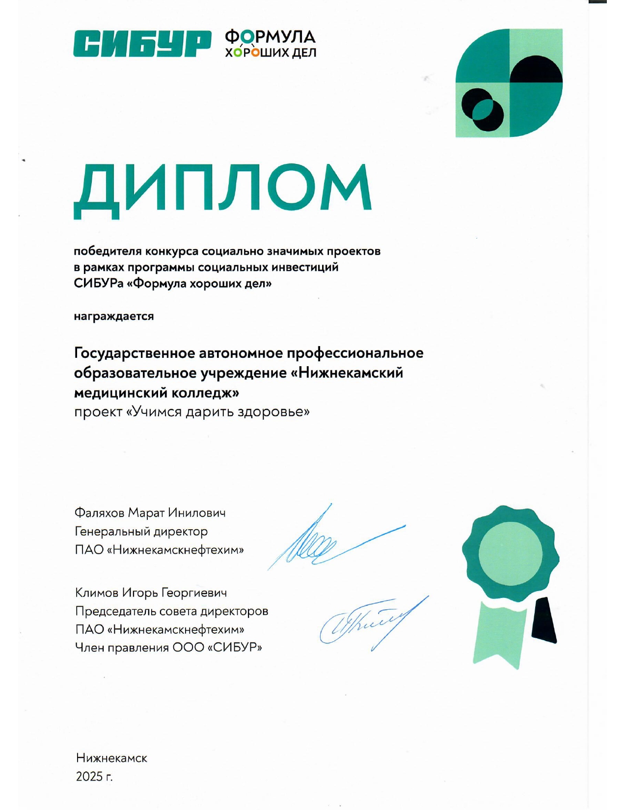 ГАПОУ «Нижнекамский медицинский колледж» стал победителем конкурса социально значимых проектов в рамках программы социальных инвестиций СИБУРа «Формула хороших дел»!