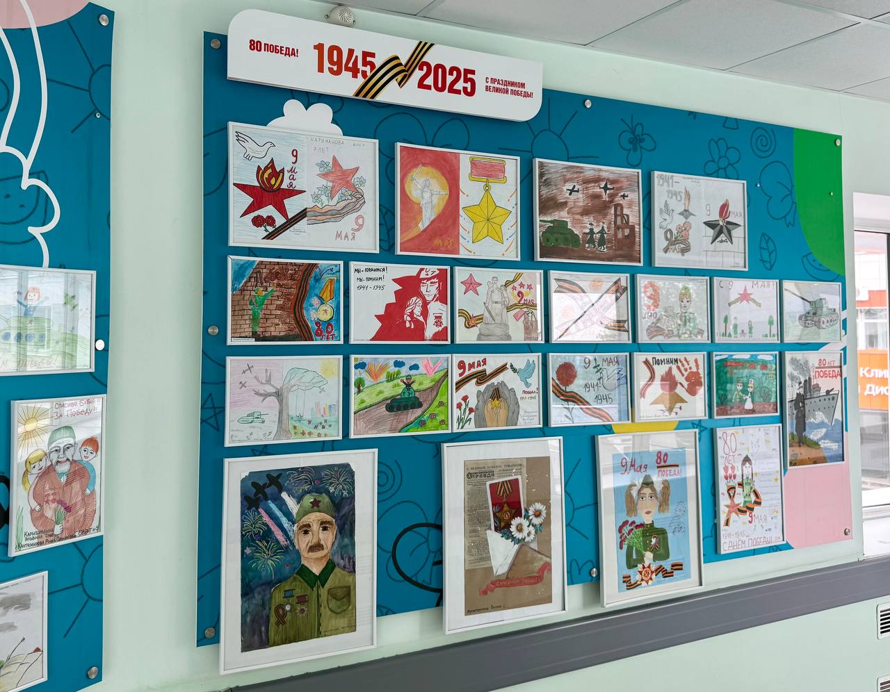 Выставка рисунков размещена в переходе между корпусами диспансера. Каждый, кто проходит мимо — сотрудники, пациенты и посетители — может остановиться, чтобы насладиться искренними и трогательными работами. Картины создают особую атмосферу тепла, благодарности и уважения к подвигу поколения победителей, напоминая о важности сохранения исторической памяти.