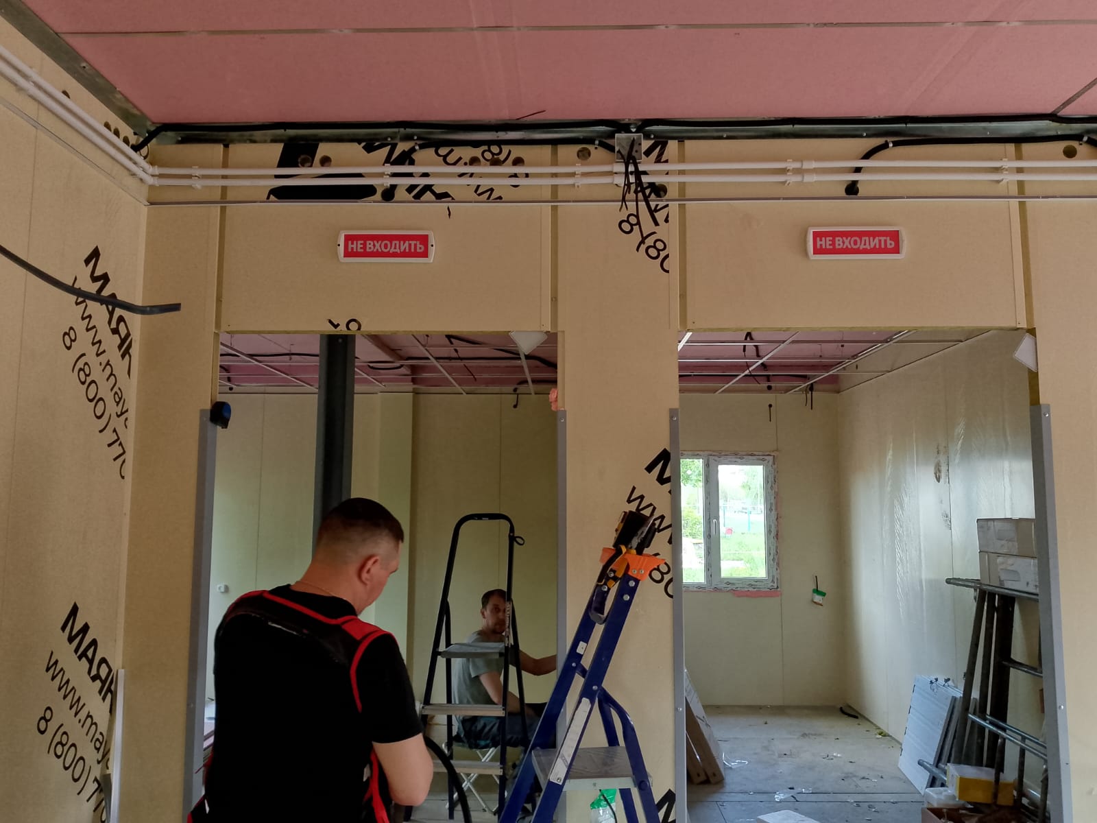 Здание медпункта возведено, установлены окна и двери, смонтирована система кондиционирования, проведена электрика, в настоящее время идут внутренние работы. Планируются работы по благоустройству прилегающей территории.