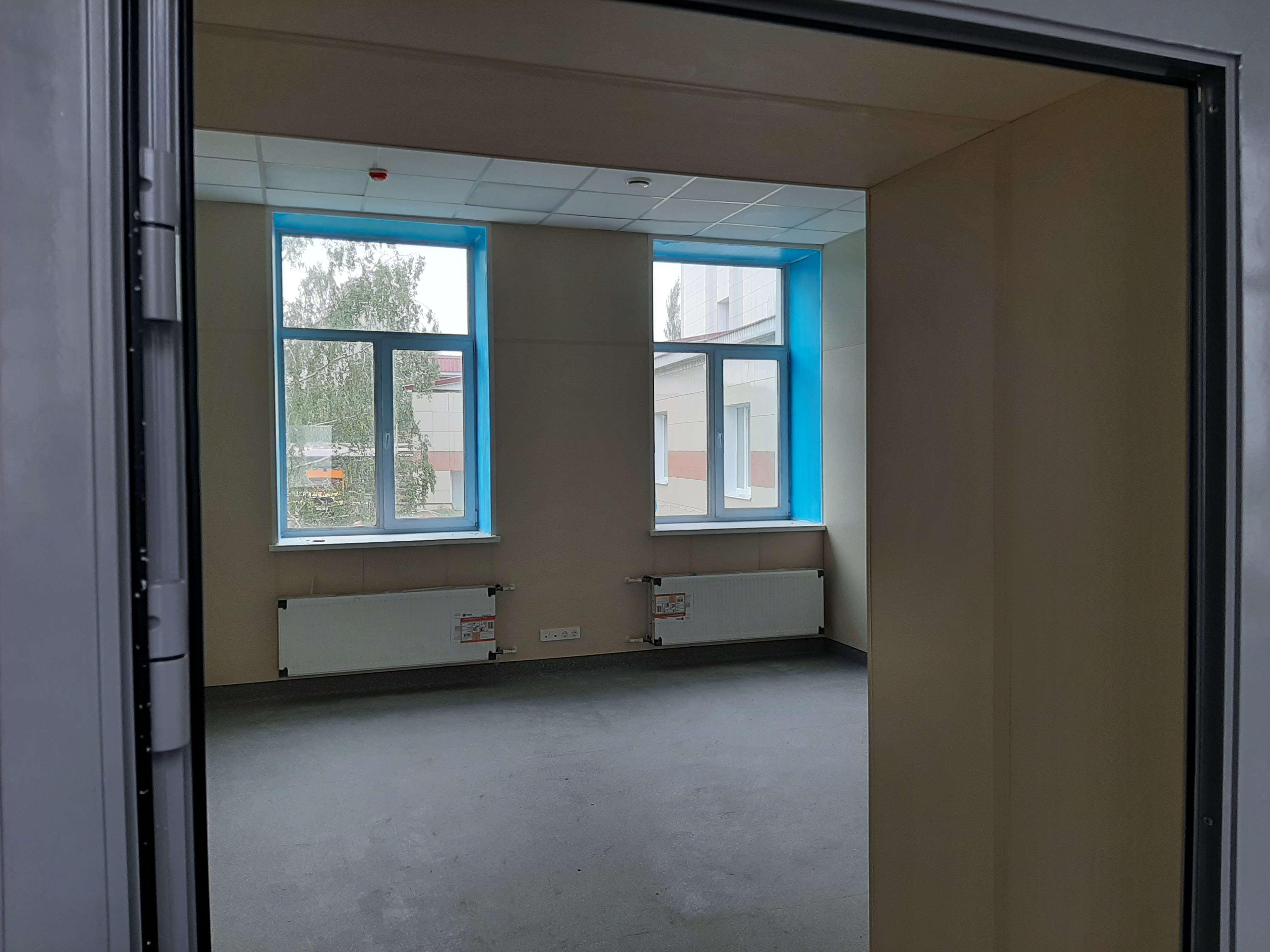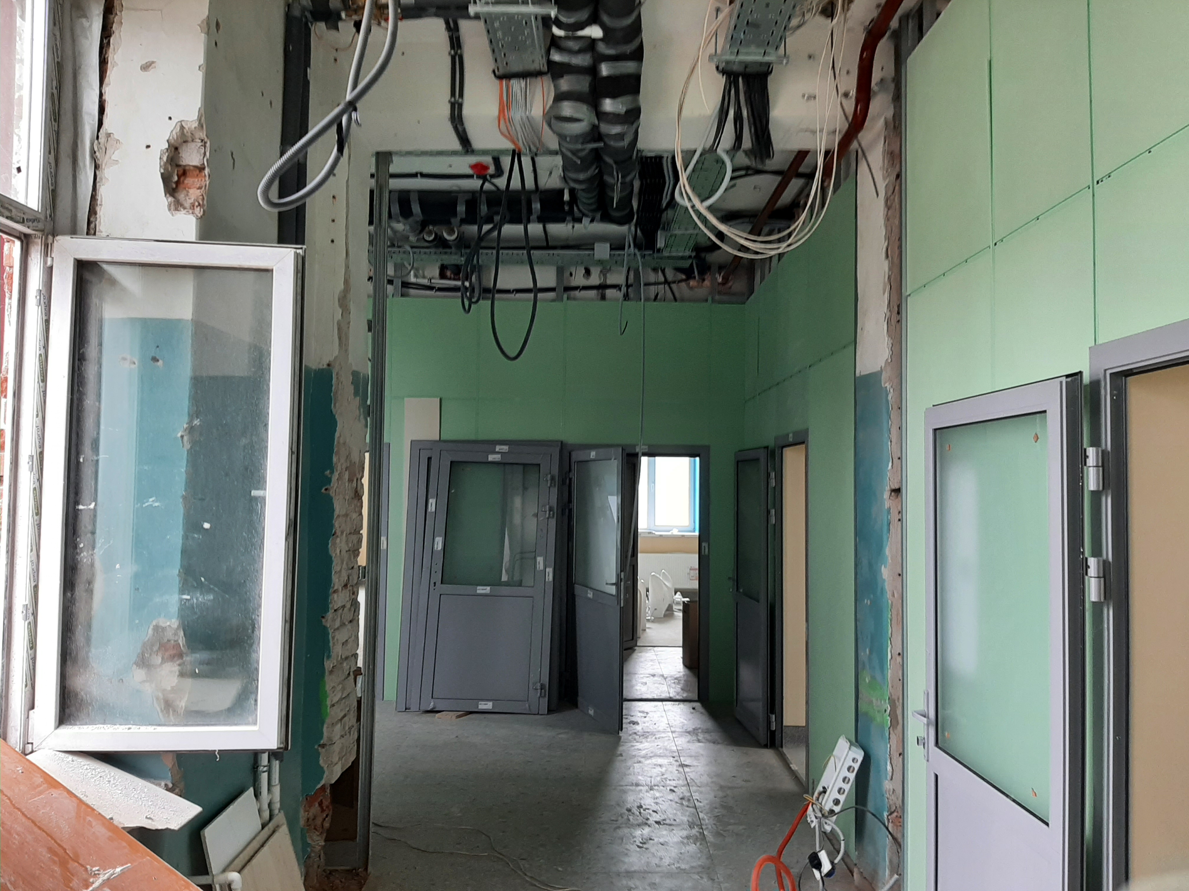 На втором этаже проводятся отделочные работы. Помещения преображаются. Уже появились новые окна, установлена напольная плитка, стеновые панели, двери обновлённых кабинетов.