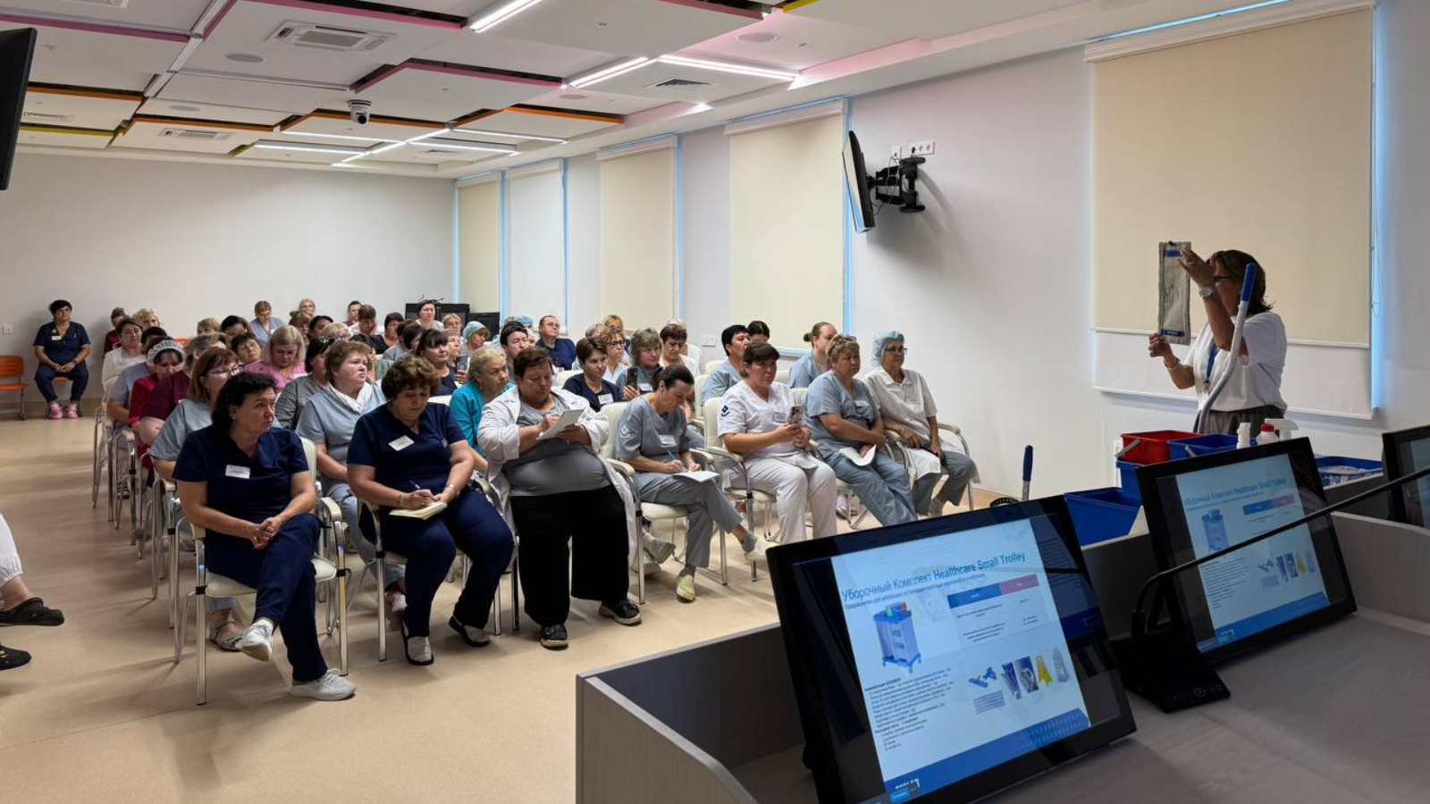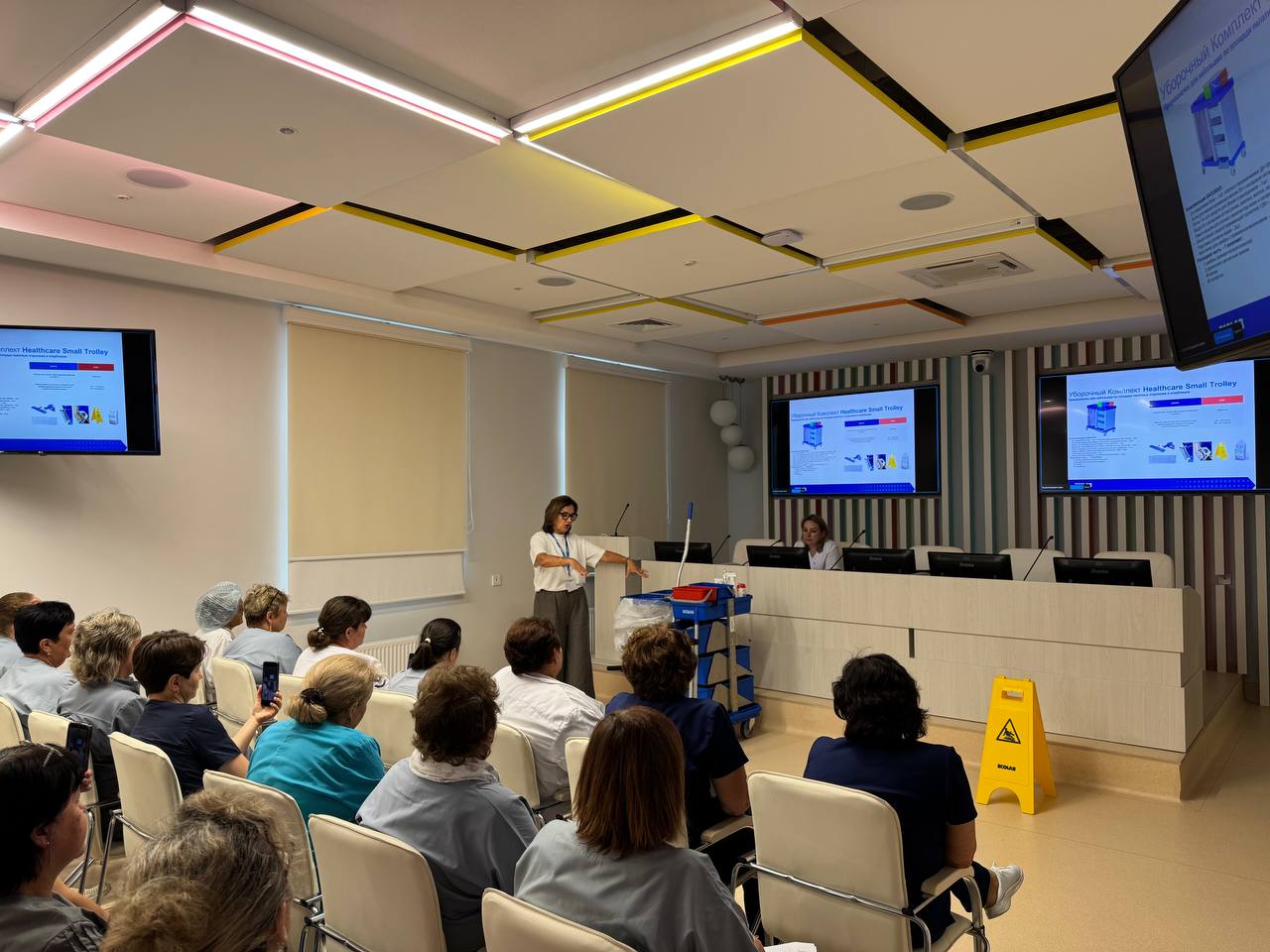Участники детально изучили последовательность действий при генеральной уборке, включающую в себя не только влажную уборку поверхностей, но и дезинфекцию труднодоступных зон, обработку медицинского оборудования и контроль качества проведенной работы.