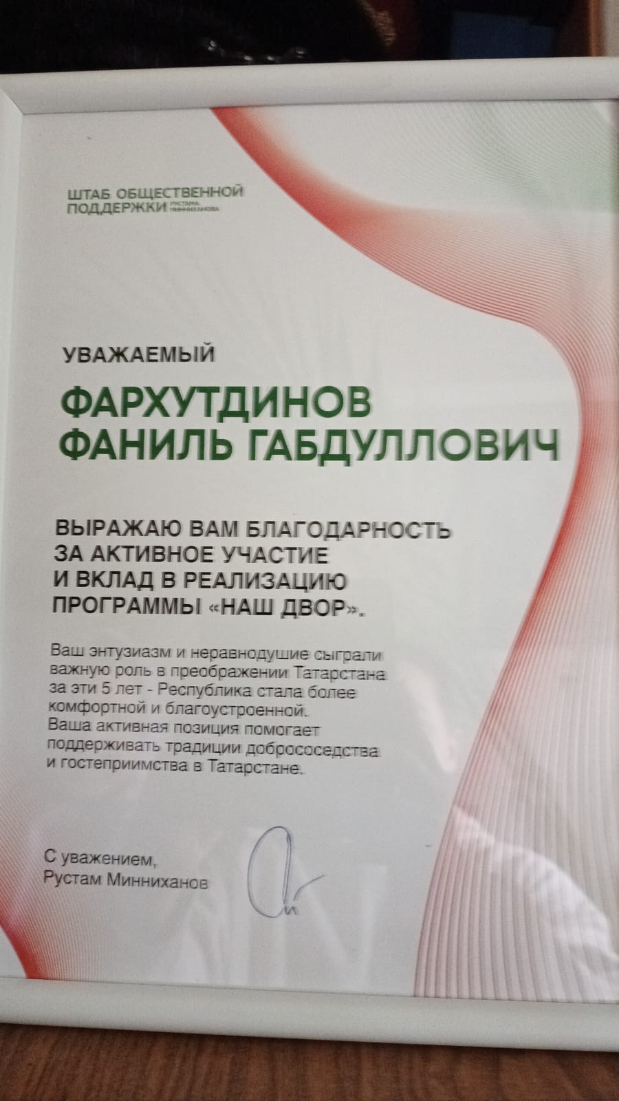 Благодаря нашим коллегам внешний вид и территория больницы преображается с каждым годом. Сотрудники больницы также приняли участие в благоустройстве своих дворов. Благодарственные письма от имени Раиса Республики Татарстан Рустама Нургалиевича Минниханова получили заместитель главного врача по административно-хозяйственной части Фаниль Габдуллович Фархутдинов и врач-невролог неврологического отделения стационара Рузиля Шайнуровна Боговеева.