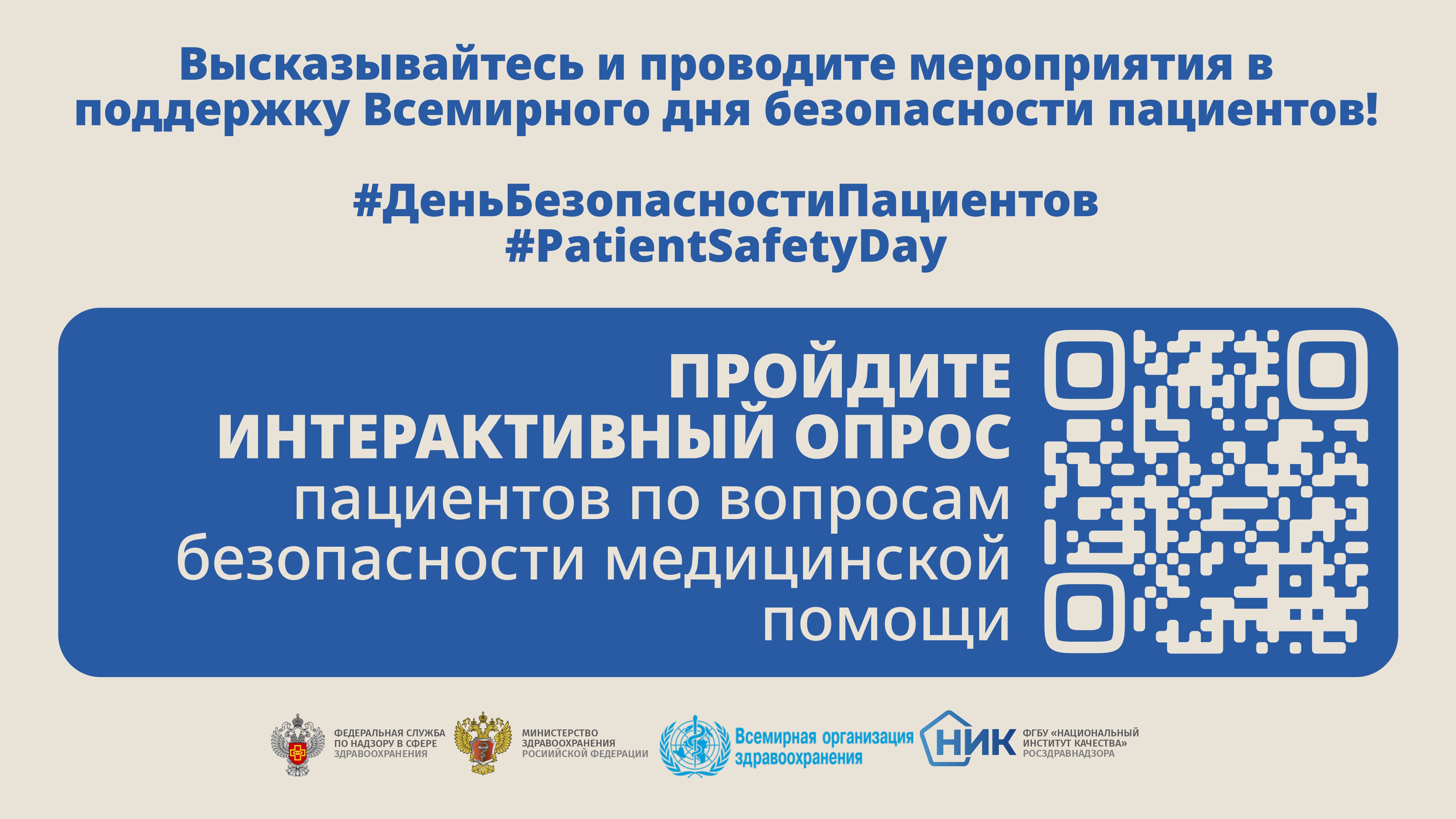 – интерактивный опрос для пациентов и медицинских работников по актуальным вопросам безопасности пациентов, цель которого – анализ осведомленности о приоритетных вопросах, связанных с безопасностью при получении и предоставлении медицинской помощи;