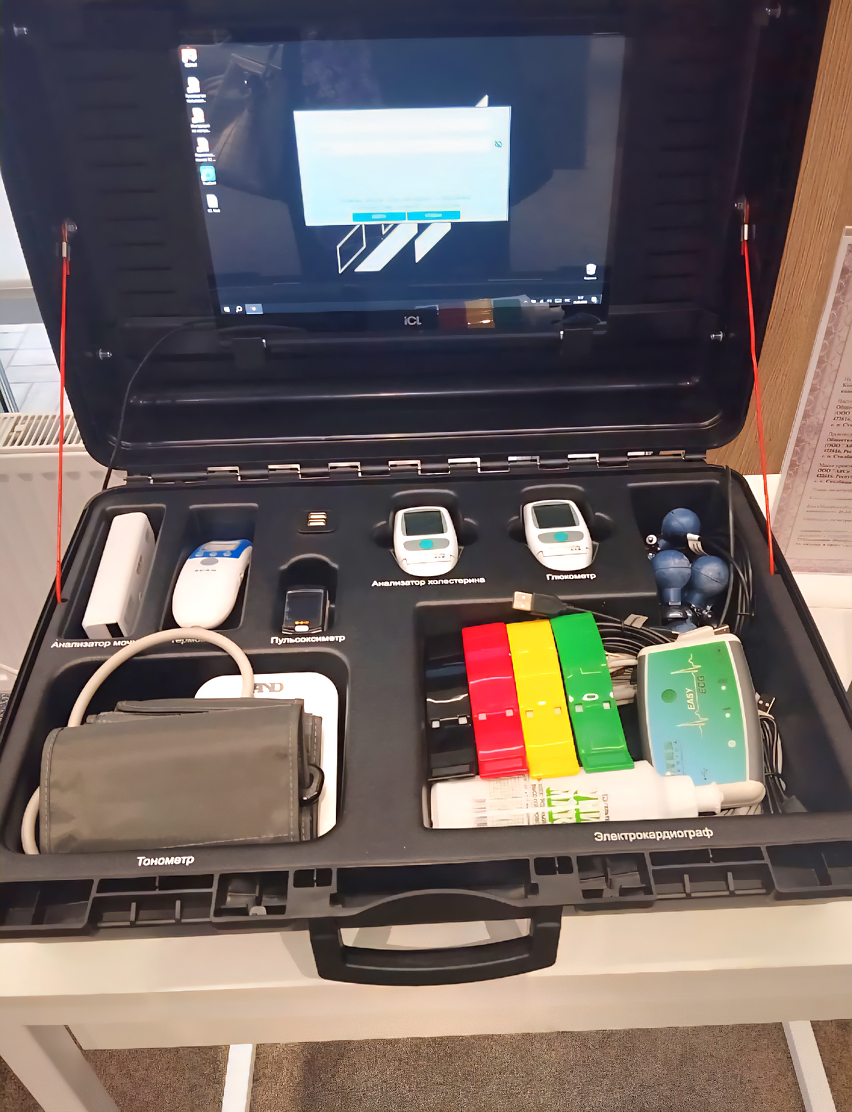 В ходе визита особое внимание уделили мобильному телемедицинскому комплексу - портативному решению для выездной работы медиков. Оборудование размещено в компактном чемодане и включает всё необходимое для первичной диагностики: ноутбук с программным обеспечением, аппарат ЭКГ, анализаторы уровня сахара и холестерина, тонометр, спирометр, измеритель глазного давления, пульсоксиметр, термометр и анализатор мочи. В ноутбук установлена программа ГИС ЭЗ РТ, которая позволяет фельдшерам на месте вносить данные о посещении пациента, фиксировать результаты анализов и обновлять электронную медкарту.
