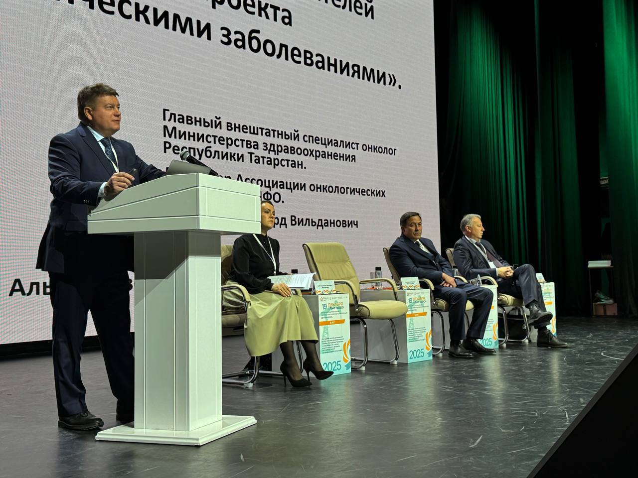 Конференция началась с доклада «Исполнение индикативных показателей регионального проекта Борьба с онкологическими заболеваниями», который представил Эдуард Нагуманов — главный внештатный онколог МЗ РТ, директор Ассоциации онкологических учреждений ПФО.