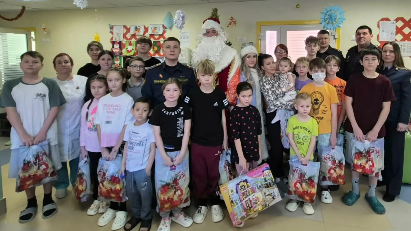 Сегодня маленьких пациентов эндокринологического отделения ДРКБ приехали поздравить коллектив ИК-2 (исправительная колония) с начальником учреждения. Вместе со сказочными героями Дедом Морозом и Снегурочкой они устроили для детей волшебное новогоднее представление.
