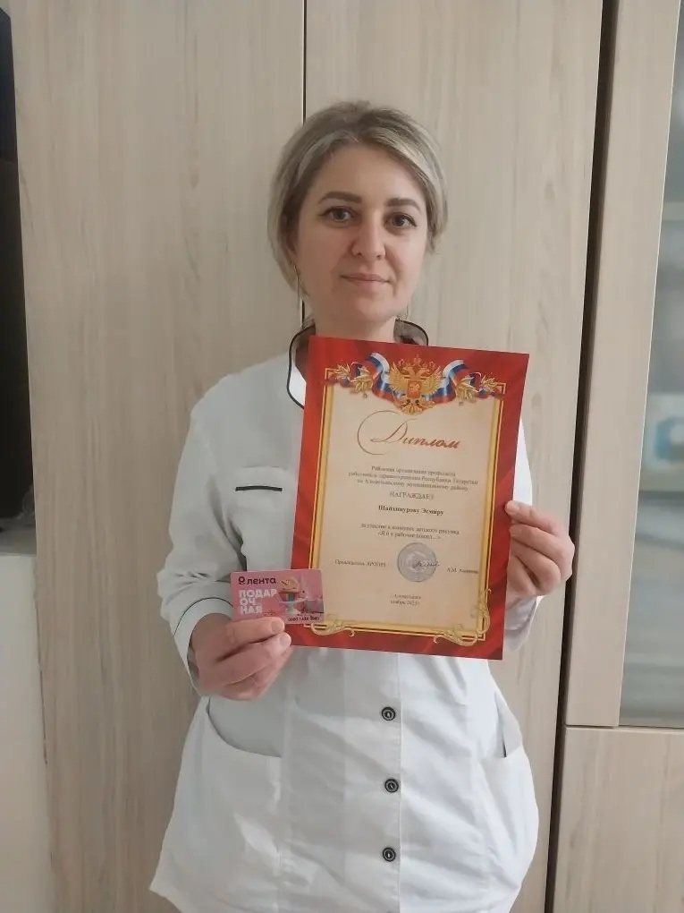 Именно их сыновья и талантливые юные художники Эсмир и Раиль были удостоены дипломов от районной организации профсоюза работников здравоохранения Республики Татарстан по Альметьевскому муниципальному району, а также им вручили от администрации и профсоюзного комитета Альметьевской ЦРБ подарочные сертификаты в один из гипермаркетов.