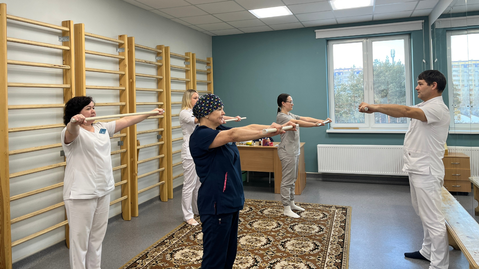 Сотрудники Альметьевской центральной районной больницы заботятся о своем здоровье. Во время перерывов они делают упражнения, чтобы поддерживать физическую форму.