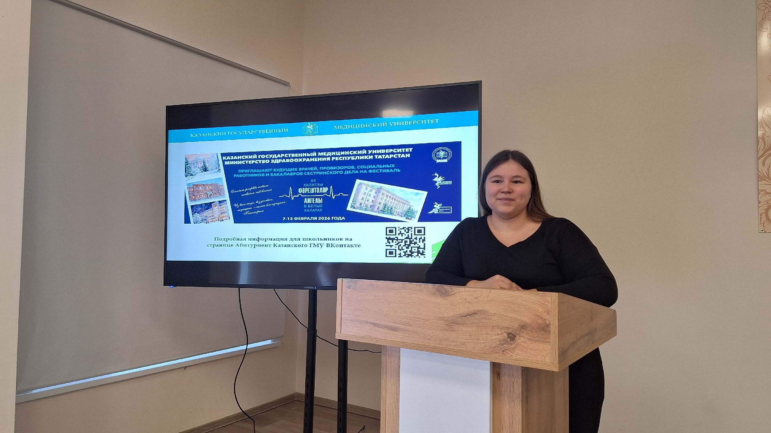 Студентка Казанского государственного медицинского университета - будущий врач терапевт, Салиса Ильдусовна Зиннатуллина подробно рассказала о возможностях обучения в Казанском государственном медицинском университете, о разнообразии направлений обучения и реализации молодого специалиста, о активной студенческой жизни и развитии молодого специалиста. Пополняющие ее выступление видеоролики об университете и студенческой жизни зажгли в глазах школьников неподдельный интерес к профессии врача.
