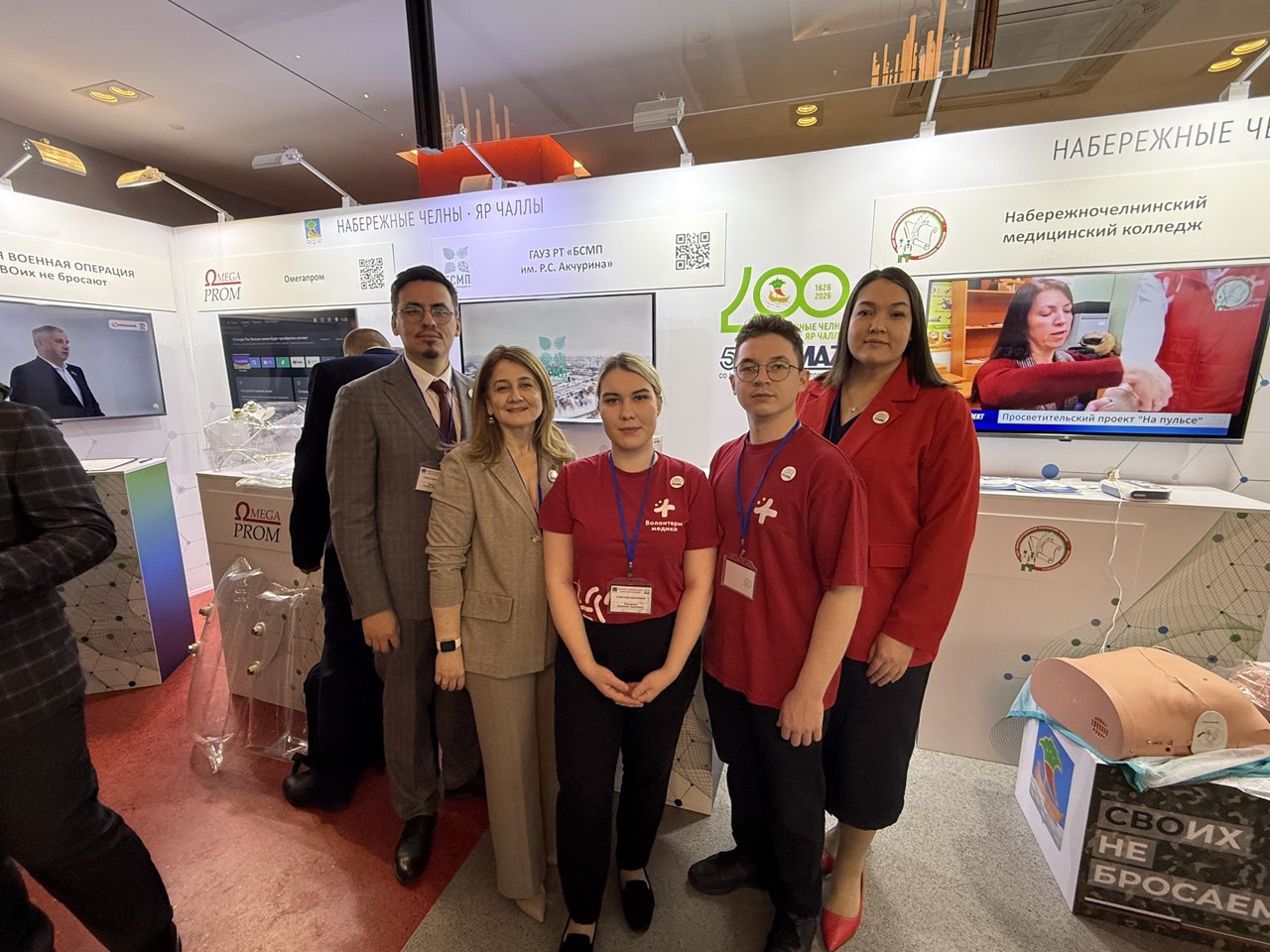 Руководитель Набережночелнинского медколледжа Нургатина Ирина Ефимовна вместе с волонтерами Хакимовой Камиллой и Хабибуллиным Тагиром представили просветительский проект "НаПульсе" на выставке итоговой сессии горсовета Набережных Челнов, приуроченной к знаменательной дате — 50-летию со дня выпуска первого автомобиля КАМАЗ