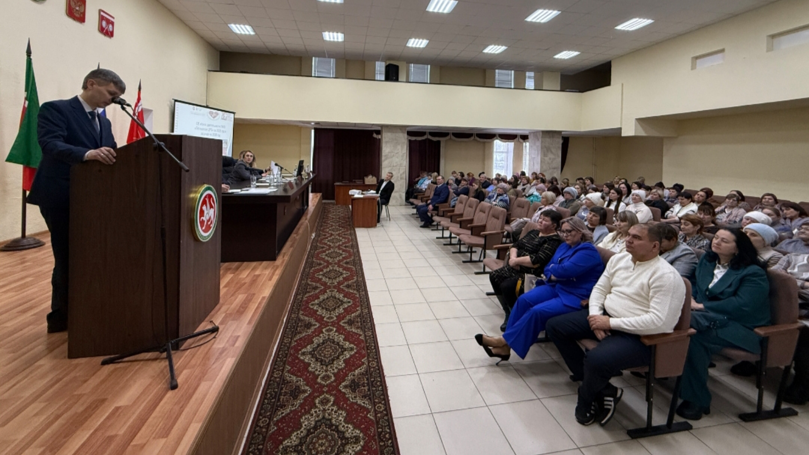 В актовом зале администрации Тетюшского района состоялось итоговое заседание медицинского совета, в котором приняли участие заместитель руководителя исполнительного комитета Тетюшского муниципального района Мария Храменкова, заместитель министра здравоохранения РТ Ильнур Сибгатов, заместитель главного врача ГКБ №7 им.М.Н.Садыкова Владимир Шерпутовский, главный врач Тетюшской центральной районной больницы Булат Кашапов, трудовой коллектив больницы.