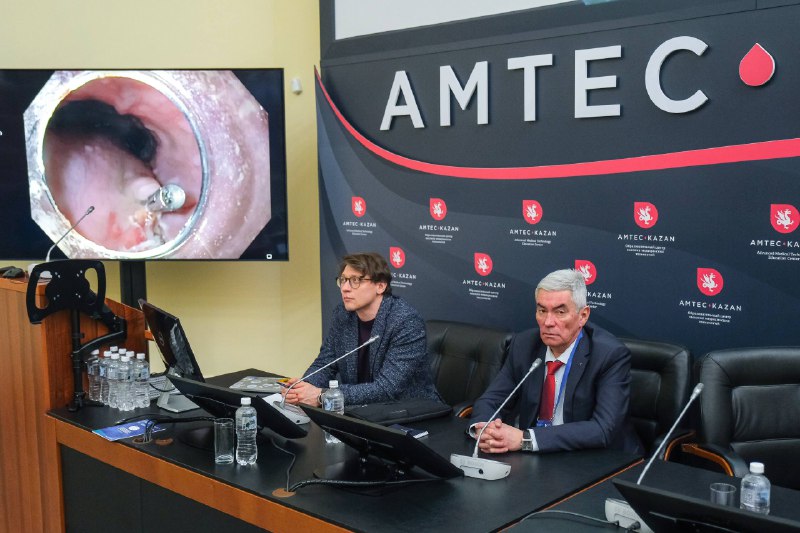 Заведующий эндоскопическим отделением РКБ Марат Назмеев и руководитель травм-центра, главный внештатный торакальный хирург Минздрава РТ Михаил Бурмистров совместно с заведующим торакальным отделением московского научного онкологического института Олегом Пикиным проводят: