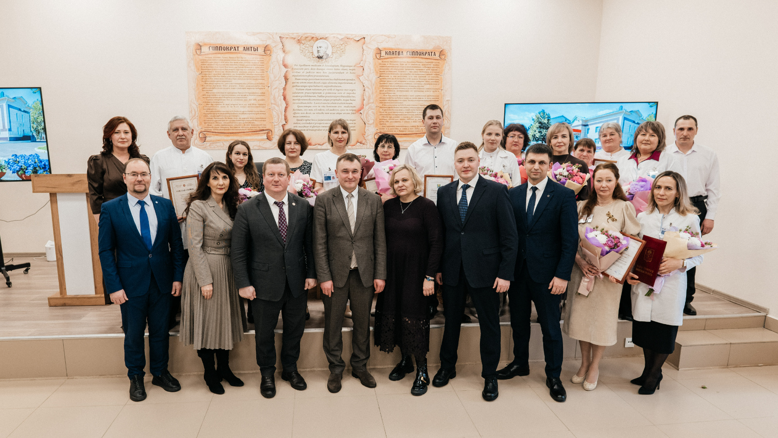 По итогам заседания Медицинского совета состоялась церемония награждения лучших сотрудников больницы. Завершилось мероприятие коллективным фотографированием с высокими гостями и награжденными.