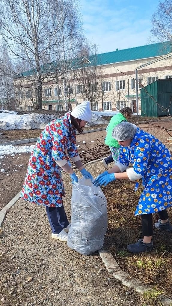 В ходе уборки территория больницы была очищена от прошлогодней листвы и мусора. Снежные массы распределены равномерно, благодаря чему двор учреждения и прилегающая территория приобрели аккуратный и ухоженный вид.