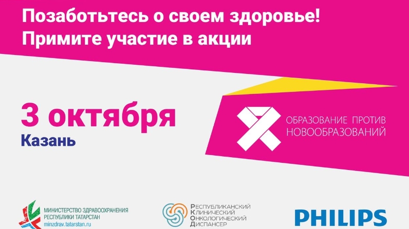 2019 елның 3 октябрендә Казан шәһәренең «МЕГА» сәүдә үзәгендә #МИНУЗДЫМ (#ЯПРОШЛА) социаль акциясе узачак. Хатын-кызлар Татарстан Республикасының әйдәүче онкологларыннан түләүсез карап тикшерү үтә алачаклар. Әлеге акция Татарстан Республикасы Сәламәтлек саклау министрлыгы, ТР ССМ Республика клиник онкология диспансеры, Philips компаниясе һәм Evolution креатив агентлыгы ярдәмендә «Мәгариф шешләргә каршы» зур масштаблы проекты чикләрендә уздырыла.