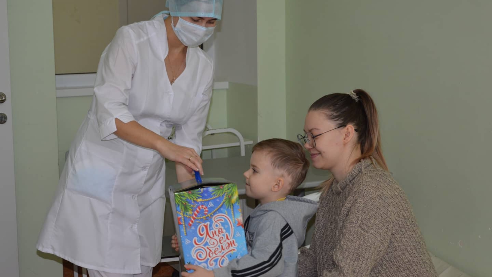 «Түбән Кама Нефтехим» компаниясе белгечләре Балалар шәһәр хастаханәсе табибларына яңа ел бүләкләре тапшырдылар. Зур тартмага тәм-томнар, календарь, уенчыклар куелган.