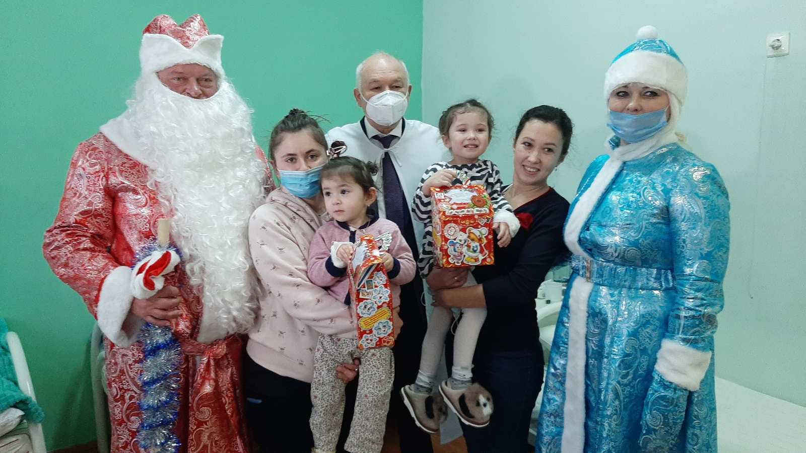 Педиатрия бүлекләрендә төрле авырулар белән 40лап бала дәвалана. Илдар Ирек улы балалар һәм аларның әти-әниләре белән аралашты. Яшь яшел үзәнлеләр үзләренең хәл-әхвәлләре турында сөйләделәр һәм Яңа ел шигырьләрен укыдылар, ә олы кунак Кыш Бабай һәм Кар Кызы белән һәр кечкенә пациентка татлы бүләк тапшырды, тиз арада сәламәтләнүләрен теләде һәм якынлашып килүче бәйрәм белән котлады.