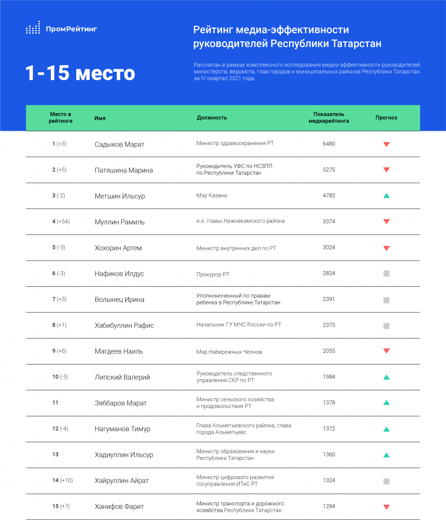 Татарстан Республикасы Сәламәтлек саклау министры Марат Садыйков 2021 елның IV кварталында медиа нәтиҗәле җитәкчеләр рейтингының лидеры булды. «ПромРейтинг» агентлыгы Татарстан Республикасы министрлыклары һәм ведомстволары җитәкчеләре, шәһәр һәм районнары башлыкларының медиа-нәтиҗәлелеген тикшерде.