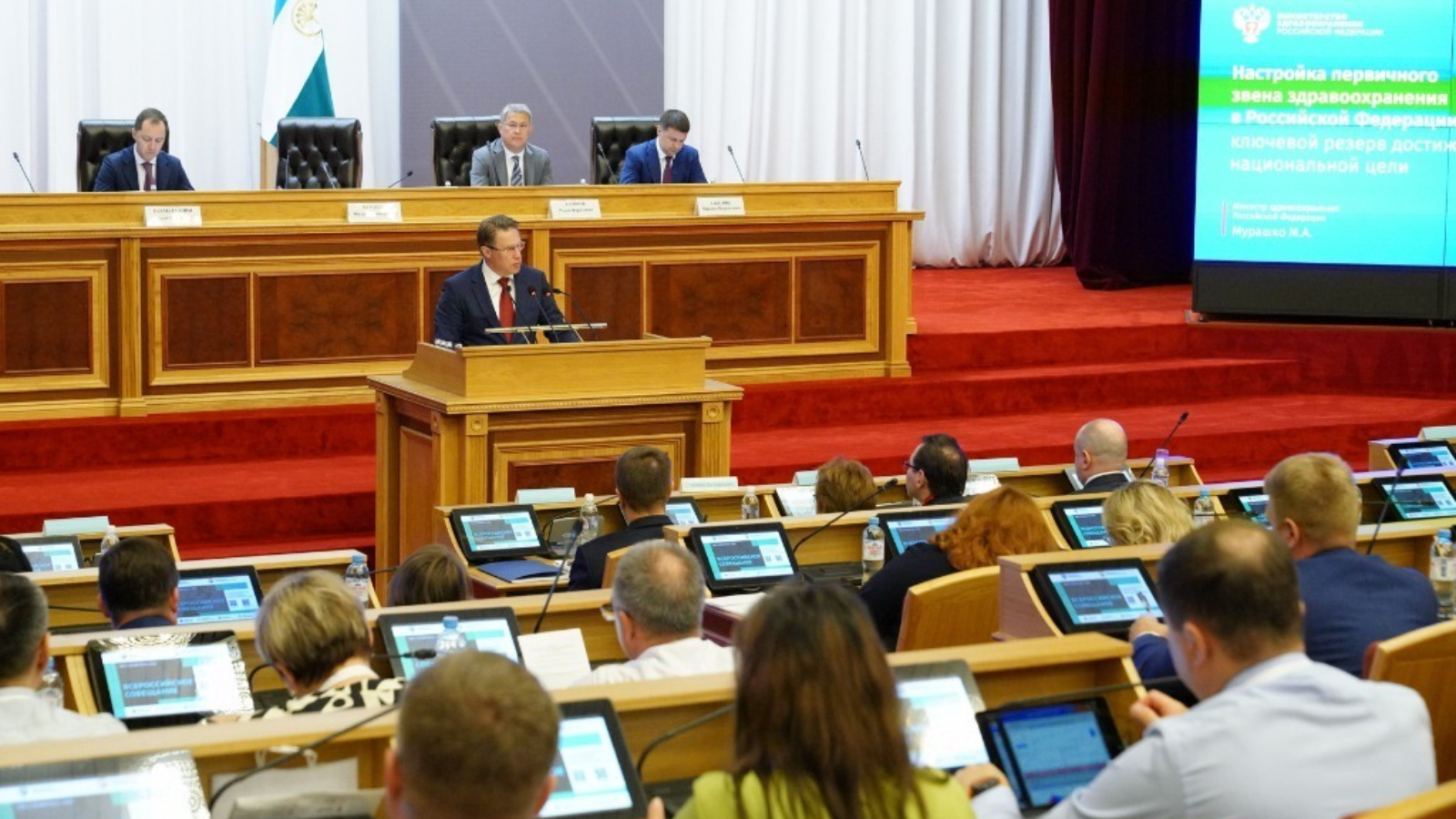 Россия Федерациясендә беренчел медицина-санитар ярдәмне үстерүнең актуаль мәсьәләләре буенча Бөтенроссия киңәшмәсендә 500дән артык сәламәтлек саклау оештыручысы — региональ сәламәтлек саклау министрлары, мәҗбүри медицина иминияте территориаль фондлары һәм Сәламәтлек саклау өлкәсендә күзәтчелек буенча федераль хезмәт җитәкчеләре, шулай ук Россия Сәламәтлек саклау министрлыгы һәм ведомство карамагындагы оешмалар вәкилләре катнаша.
